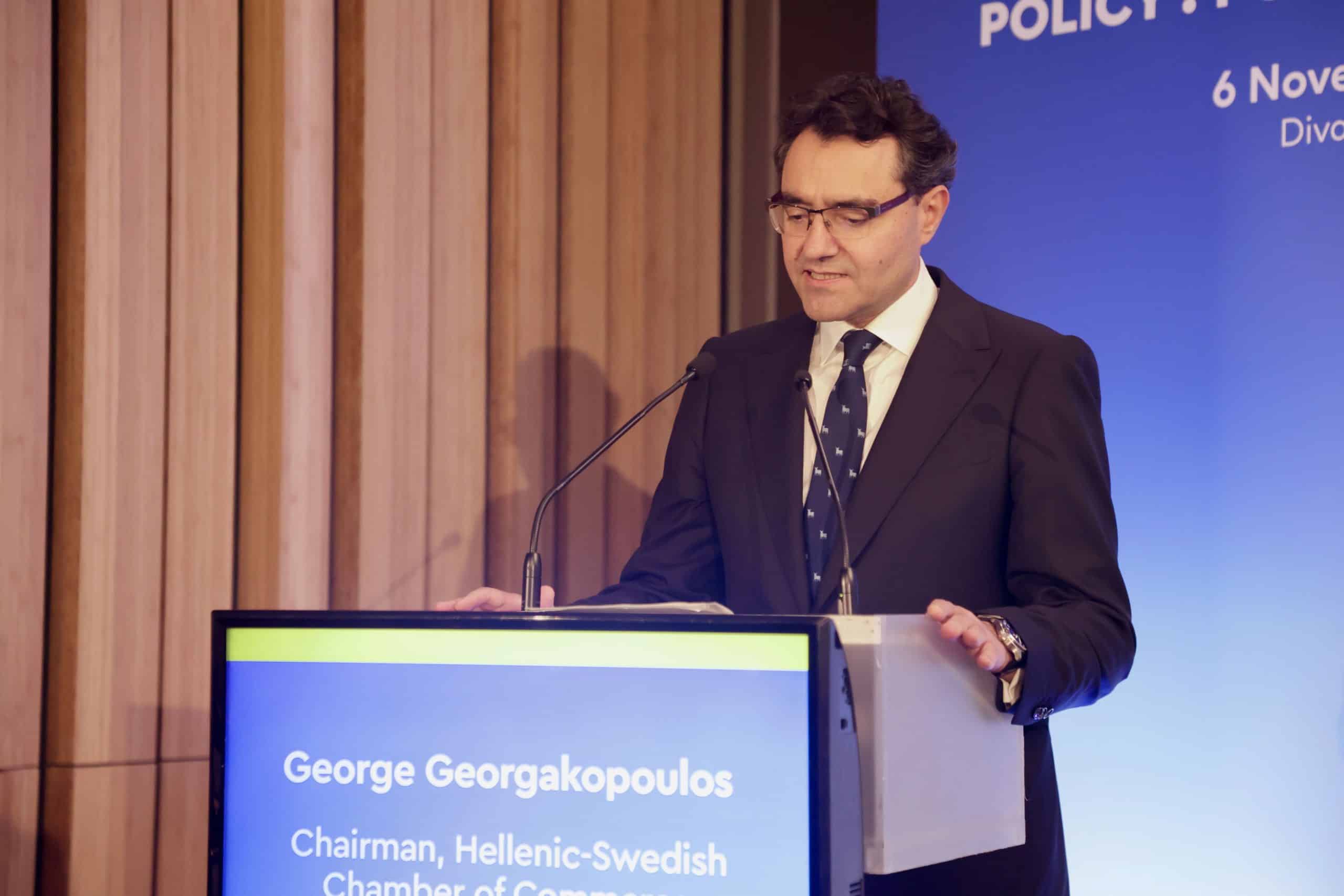 Στον εναρκτήριο χαιρετισμό του ο κ. Γεώργιος Γεωργακόπουλος, Πρόεδρος του Ελληνοσουηδικού Επιμελητηρίου, ανέφερε: «Η Ελλάδα και η Σουηδία μπορεί να διαφέρουν γεωγραφικά και ιστορικά, αλλά μοιραζόμαστε ορισμένες σημαντικές αξίες: την ανοιχτότητα, την καινοτομία και τον σεβασμό για τη βιωσιμότητα και τα ανθρώπινα δικαιώματα. Και πάνω απ’ όλα, μοιραζόμαστε την πεποίθηση ότι η συνεργασία είναι δύναμη. Ζούμε σε μια εποχή όπου οι πολιτικές και οι προτεραιότητες μπορούν να αλλάξουν από τη μια μέρα στην άλλη -μερικές φορές ακόμη και σε πραγματικό χρόνο. Αλλά πίσω από τον θόρυβο, παραμένει μια αλήθεια: Η πρόοδος εξαρτάται από σταθερές συνεργασίες και κοινό σκοπό. Με την πάροδο των ετών, οι σουηδικές εταιρείες στην Ελλάδα έχουν ακμάσει όχι μέσω της επιβολής, αλλά δια της σταθερής συνεργασίας. Έχουν χτίσει εμπιστοσύνη, έχουν επενδύσει σε ανθρώπους και έχουν δείξει ότι η σουηδική επιχειρηματική κουλτούρα του διαλόγου, της ισότητας και του σεβασμού δημιουργεί διαρκή επιτυχία».