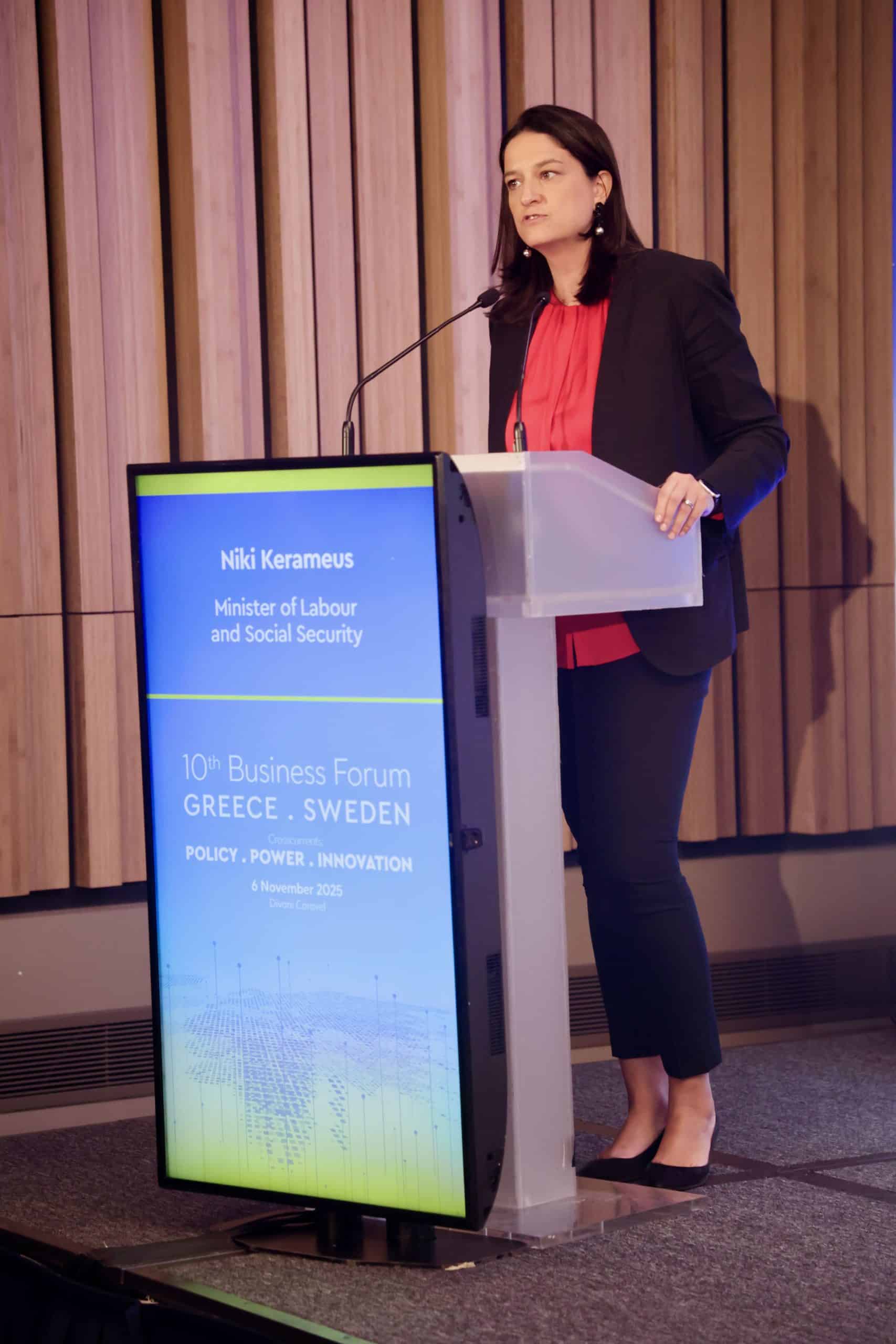 Η Υπουργός Εργασίας και Κοινωνικής Ασφάλισης, κα. Νίκη Κεραμέως,  αφού εξέφρασε την χαρά της να συμμετέχει στο επετειακό, 10ο Φόρουμ του Ελληνοσουηδικού Επιμελητηρίου, δήλωσε: «Η Γεωπολιτική, η Ενέργεια, και η Άμυνα και η Καινοτομία, αποτελούν βασικούς τομείς πολιτικής. Τα θέματα αυτά δεν αφορούν μόνο κυβερνήσεις και θεσμούς, αλλά και επιχειρήσεις, επενδυτές και κοινωνίες που επιδιώκουν να επιβιώσουν σε ένα ταχέως μεταβαλλόμενο παγκόσμιο περιβάλλον. Δεν υπάρχει αμφιβολία ότι ζούμε σε ταραχώδεις καιρούς. Καιρούς που φέρνουν μαζί τους τόσο σημαντικές προκλήσεις όσο και αξιοσημείωτες ευκαιρίες. Ωστόσο, είναι ακριβώς σε τέτοιες στιγμές που η συνεργασία και το κοινό όραμα έχουν τη μεγαλύτερη σημασία. Με τις κοινές μας προσπάθειες, τις κοινές μας αξίες και τη συλλογική μας αποφασιστικότητα να οικοδομήσουμε ένα φωτεινότερο μέλλον, μπορούμε να δημιουργήσουμε κοινωνίες πιο ανθεκτικές,  καινοτόμες και συμπεριληπτικές — κοινωνίες που μετατρέπουν την αβεβαιότητα σε πρόοδο και την ευκαιρία σε ευημερία για όλους».