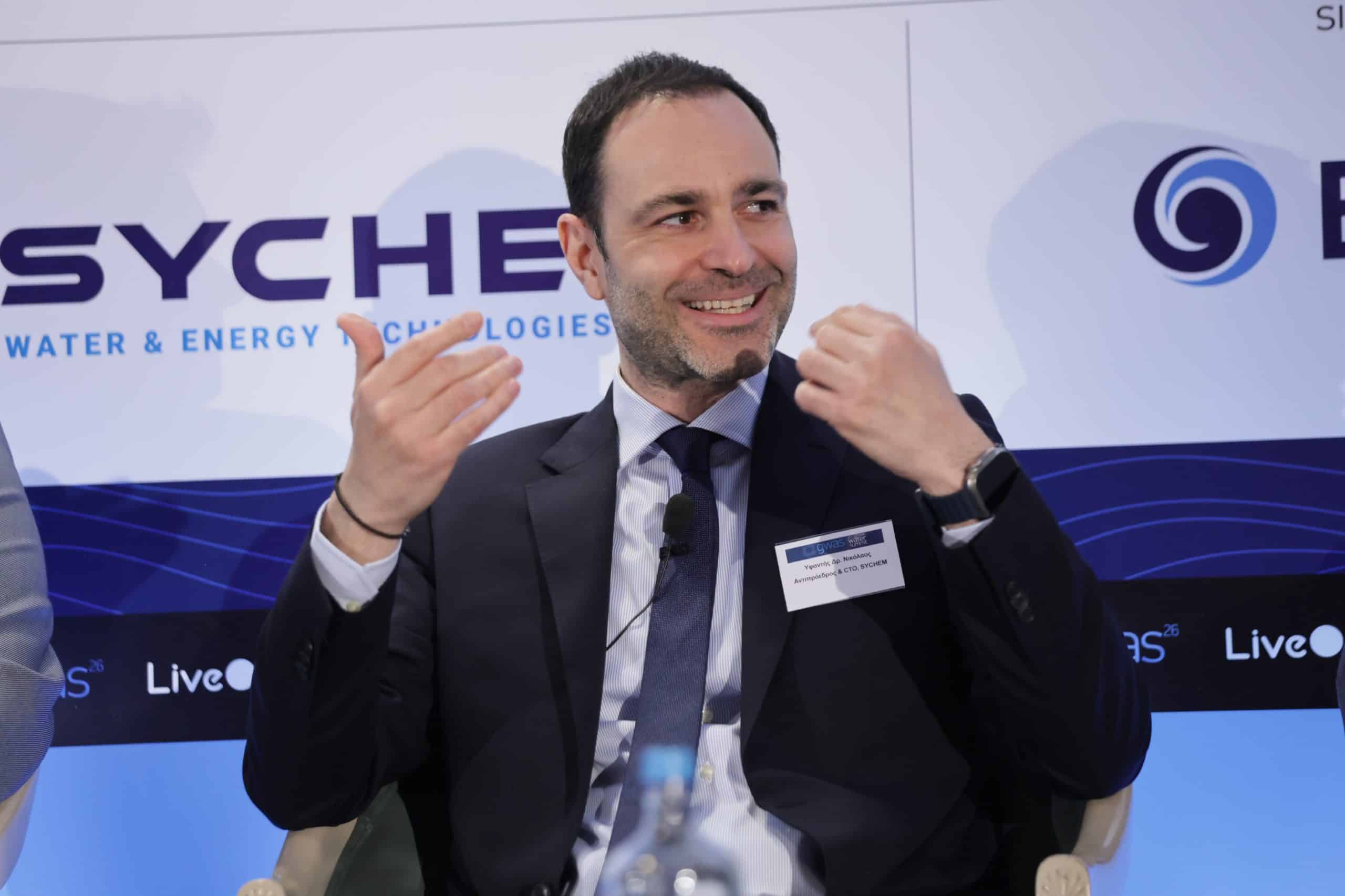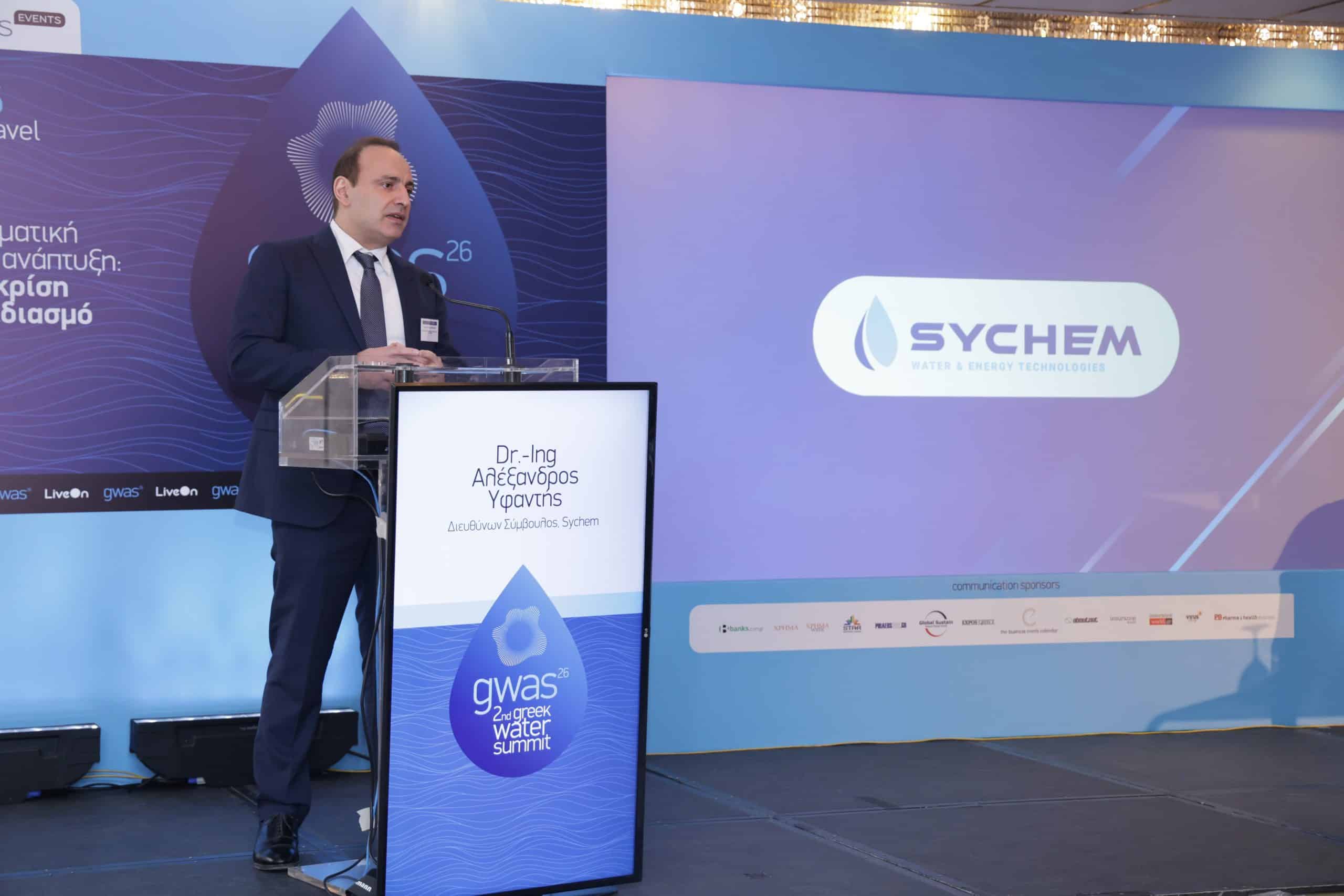 Στην ίδια ενότητα, ο Dr.-Ing. Αλέξανδρος Υφαντής, Πρόεδρος & Διευθύνων Σύμβουλος της SYCHEM, ανέδειξε τη στενή διασύνδεση νερού και ενέργειας ως θεμελιώδη πυρήνα της βιώσιμης ανάπτυξης. Παρουσίασε την εξέλιξη της εταιρείας του σε διεθνή ηγέτη στην αφαλάτωση, με παραγωγή στην Κρήτη, 281 εργαζομένους και εξαγωγές σε 30 χώρες, καθώς και τη δραστηριότητα σε ενέργεια, βιοαέριο και αντιδιαβρωτική προστασία.