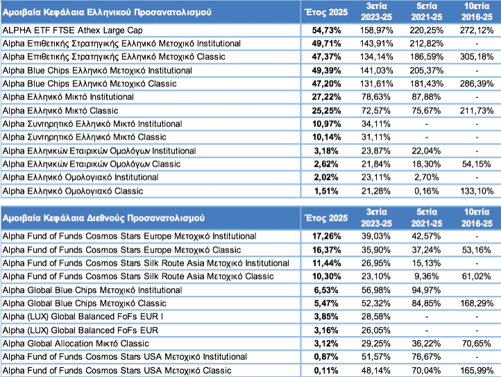 Το 2025, καταγράφηκαν υψηλές εισροές στα ελληνικά μετοχικά και μικτά αμοιβαία κεφάλαια της Εταιρείας, καθώς και διψήφιες αποδόσεις σε μεγάλο μέρος των προϊόντων αυτών, επιβραβεύοντας την εμπιστοσύνη των επενδυτών στην Alpha Asset Management.