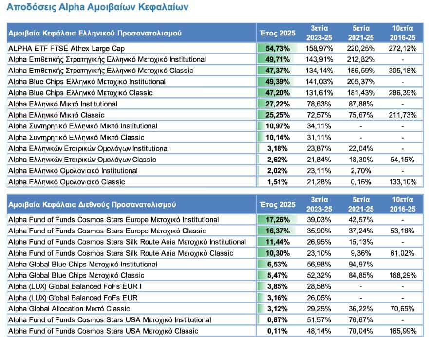 Το 2025 καταγράφηκαν υψηλές εισροές στα ελληνικά μετοχικά και μικτά αμοιβαία κεφάλαια της Εταιρείας, καθώς και διψήφιες αποδόσεις σε μεγάλο μέρος των προϊόντων αυτών, επιβραβεύοντας την εμπιστοσύνη των επενδυτών στην Alpha Asset Management.