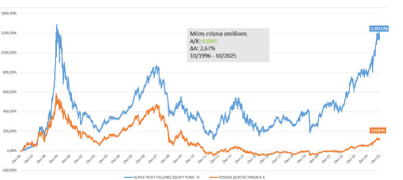 Το Αμοιβαίο Κεφάλαιο της ALPHA TRUST έχει σημειώσει διαχρονικά εντυπωσιακή πορεία, με την κατηγορία μεριδίων R να έχει επιτύχει από την έναρξή του (ακέραια έτη από 31/10/1996 έως 31/10/2025) σωρευτική απόδοση +1.147,17%, υπεραποδίδοντας του Γενικού Δείκτη Τιμών Χ.Α. που σημείωσε απόδοση +114,85% την αντίστοιχη περίοδο, επιβεβαιώνοντας τη συνέπεια στη δημιουργία αξίας για τους μεριδιούχους του.