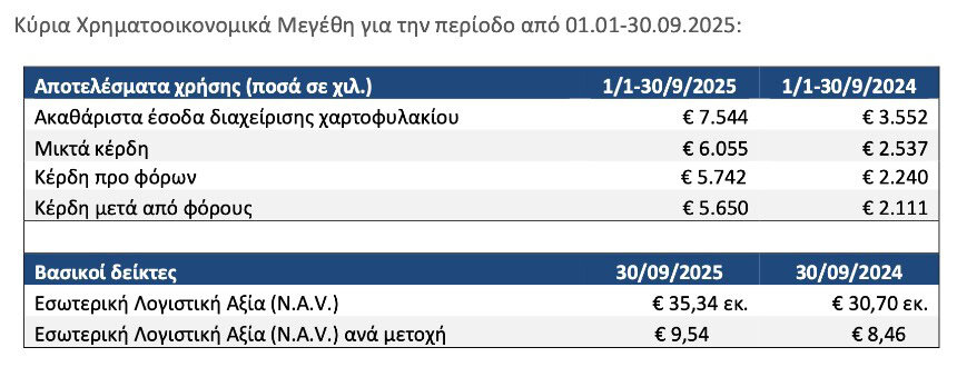 Για την περίοδο από 01/01/2025 έως 30/09/2025 το χαρτοφυλάκιο της εταιρείας σημείωσε απόδοση 18,54% με την εσωτερική αξία του χαρτοφυλακίου (Ν.Α.V.) να ανέρχεται σε € 35,34 εκατ. ή € 9,54 ανά μετοχή στις 30/09/2025.