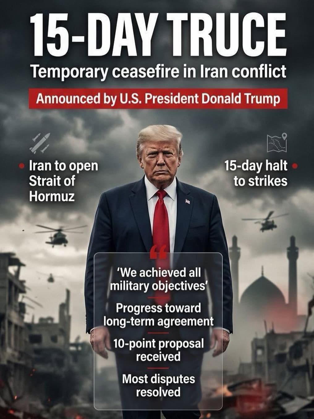 - «Συμφωνώ να αναστείλω τους βομβαρδισμούς και την επίθεση κατά του Ιράν για περίοδο δύο εβδομάδων»,