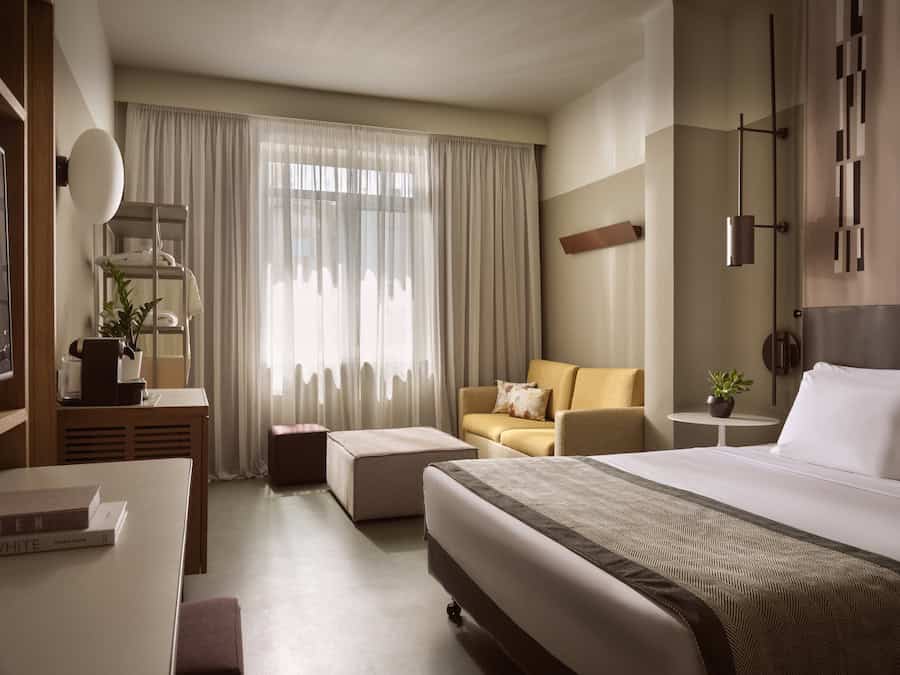 Τα 125 δωμάτια και σουίτες ανανεώθηκαν πλήρως, από τα Standard δωμάτια έως την The One Suite. Οι νέοι χώροι αποπνέουν άνεση και ηρεμία, με ενσωματωμένα custom-made έπιπλα σε χρωματική παλέτα με ουδέτερους γήινους τόνους – πράσινο, μπεζ και φυσικό ξύλο. Η εμπειρία διαμονής αναβαθμίζεται με σύγχρονες τεχνολογικές λύσεις, με τα δωμάτια να διαθέτουν σύστημα keyless entry, έξυπνα χειριστήρια θερμοκρασίας και φωτισμού, USB power hubs και premium υφάσματα. Χαρακτηριστικό στοιχείο αποτελεί η πράσινη επένδυση περιμετρικά του λουτρού που προσθέτει βάθος και ενδιαφέρον στον χώρο.