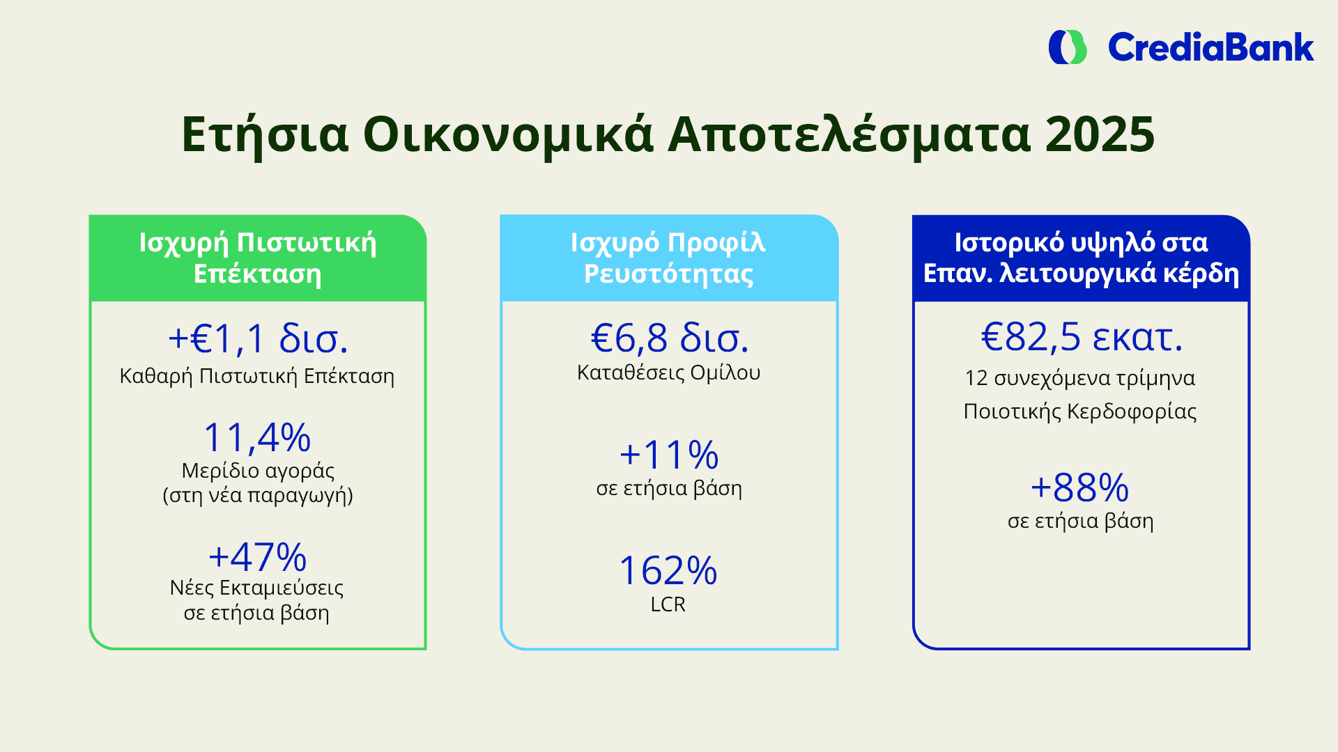 Το 2025, μια χρονιά επανεκκίνησης για την CrediaBank, η Τράπεζα πέτυχε σημαντική πιστωτική επέκταση, ενώ διατήρησε υψηλά επίπεδα ρευστότητας, καταγράφοντας ιστορικό ρεκόρ καταθέσεων.