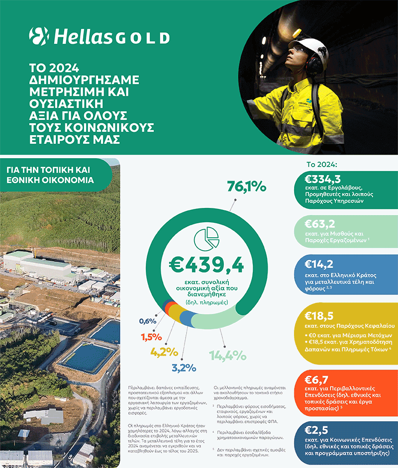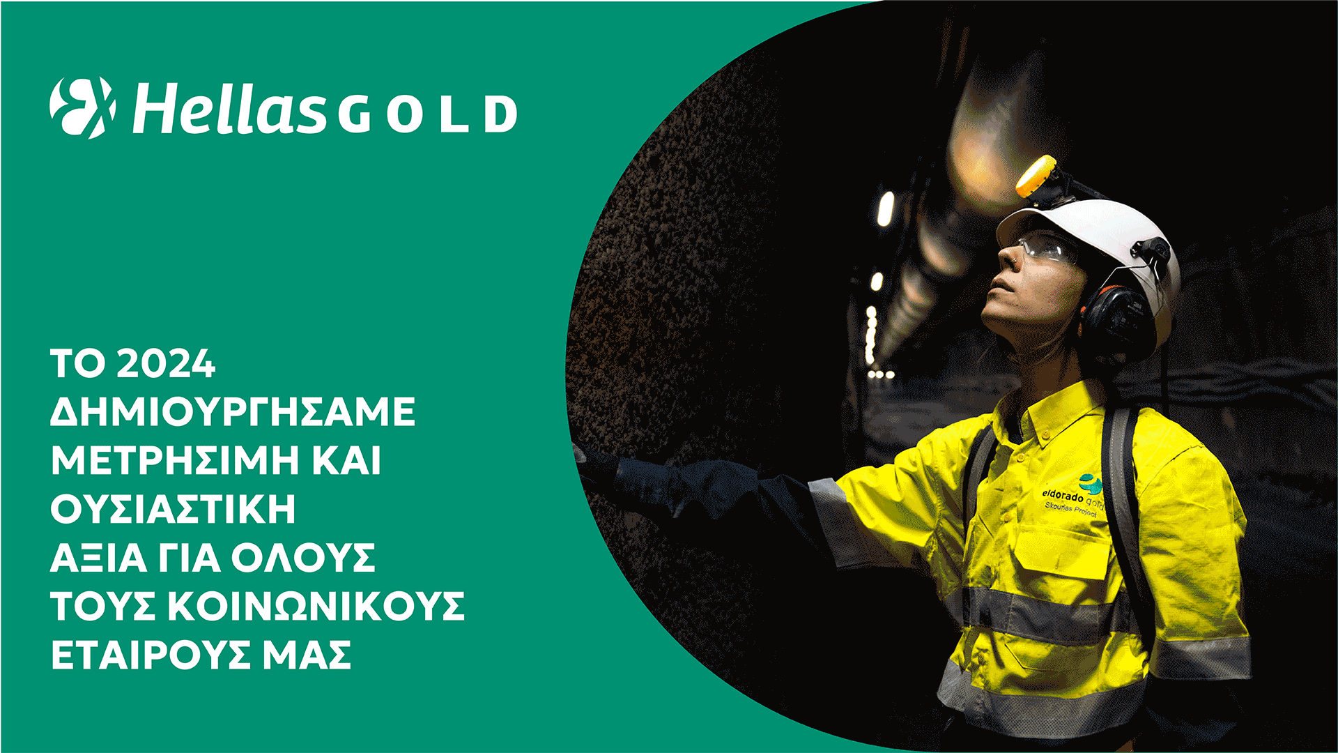 Η Ελληνικός Χρυσός δημοσιεύει την Έκθεση Επίδοσης Κοινωνικής Υπευθυνότητας για το 2024, καταγράφοντας μια χρονιά ουσιαστικής προόδου σε όλους τους στρατηγικούς πυλώνες Βιωσιμότητας που έχει ορίσει. Η φετινή έκθεση, αποτυπώνει τη συνέπεια και την πρόοδο της εταιρείας στη διαμόρφωση ενός ανθεκτικού και υπεύθυνου επιχειρηματικού μοντέλου, που δημιουργεί μετρήσιμη αξία για την οικονομία και την κοινωνία, προστατεύοντας ταυτόχρονα το περιβάλλον που φιλοξενεί τις δραστηριότητές της.