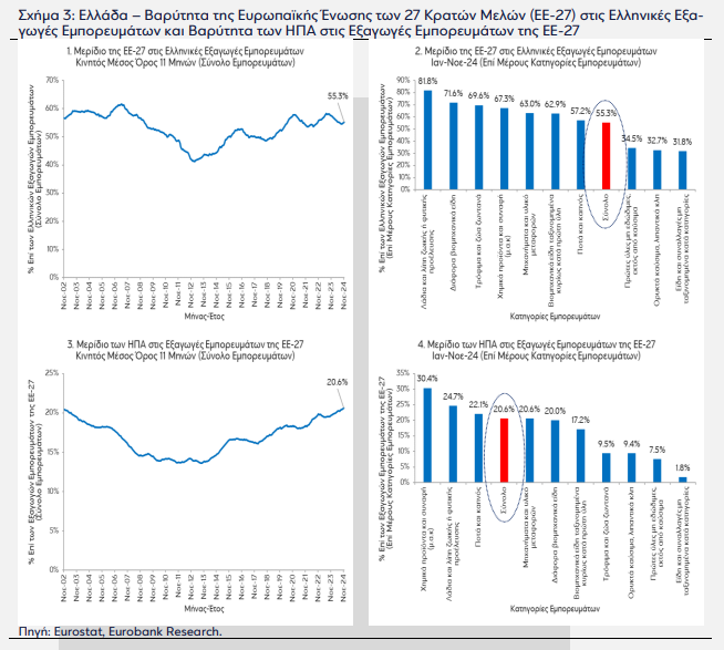 Το 11μηνο Ιαν-Νοε-24 η βαρύτητα των ΗΠΑ επί του συνόλου των ελληνικών εξαγωγών εμπορευμάτων ήταν της τάξης του 4,8% ή €2.193,8 εκατ. σε τρέχουσες τιμές. Ωστόσο, πέρα από άμεσες, οι επιπτώσεις στην ελληνική οικονομία από πιθανές πολιτικές προστατευτισμού εκ μέρους των ΗΠΑ δύναται να είναι και έμμεσες. Οι έμμεσες επιπτώσεις μπορεί να προέλθουν από τους εμπορικούς δεσμούς της Ελλάδας με την Ευρωπαϊκή Ένωση των 27 κρατών-μελών, καθότι περί το 20% των εξαγωγών εμπορευμάτων της ΕΕ αγοράζεται από φορείς των ΗΠΑ.