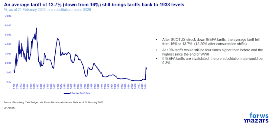 H αβεβαιότητα για τις αγορές και τις επιχειρήσεις θα ενταθεί. Δεν γνωρίζει κανείς το δημοσιονομικό κενό που μπορεί να δημιουργηθεί σε περίπτωση επιστροφής φόρων, ούτε ποιος θα είναι ο μηχανισμός για αυτήν. Επίσης, ανοίγουν αρκετά καινούργια νομικά μέτωπα στην (σχεδόν σίγουρη) περίπτωση που ο Πρόεδρος αποφασίσει να επιβάλει φρέσκους δασμούς.