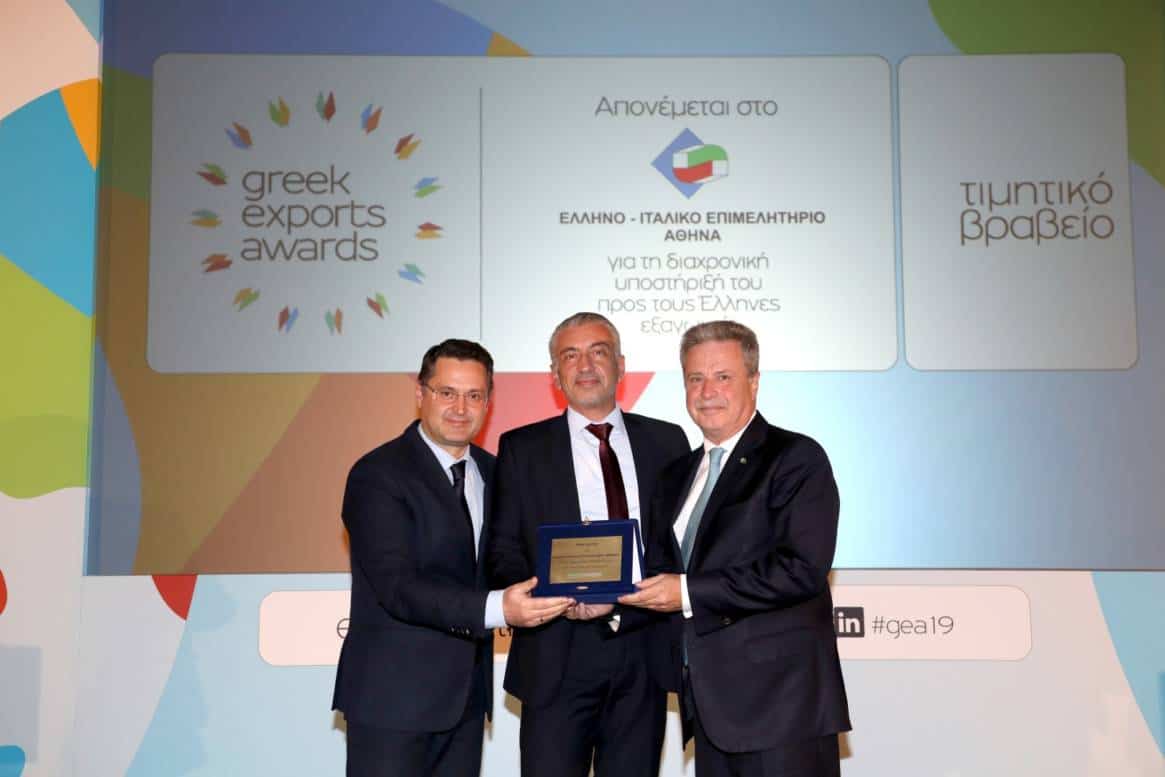 Η δεύτερη τιμητική διάκριση απονεμήθηκε στο Ελληνο – Ιταλικό Επιμελητήριο της Αθήνας για την πολυετή υποστήριξή του στους Έλληνες εξαγωγείς. Το βραβείο παρέλαβε ο Πρόεδρος του Επιμελητηρίου, κ. Ιωάννης Τσαμίχας και ο ΓΓ του Επιμελητηρίου, κ. Παναγιώτης Βαμβακάρης.