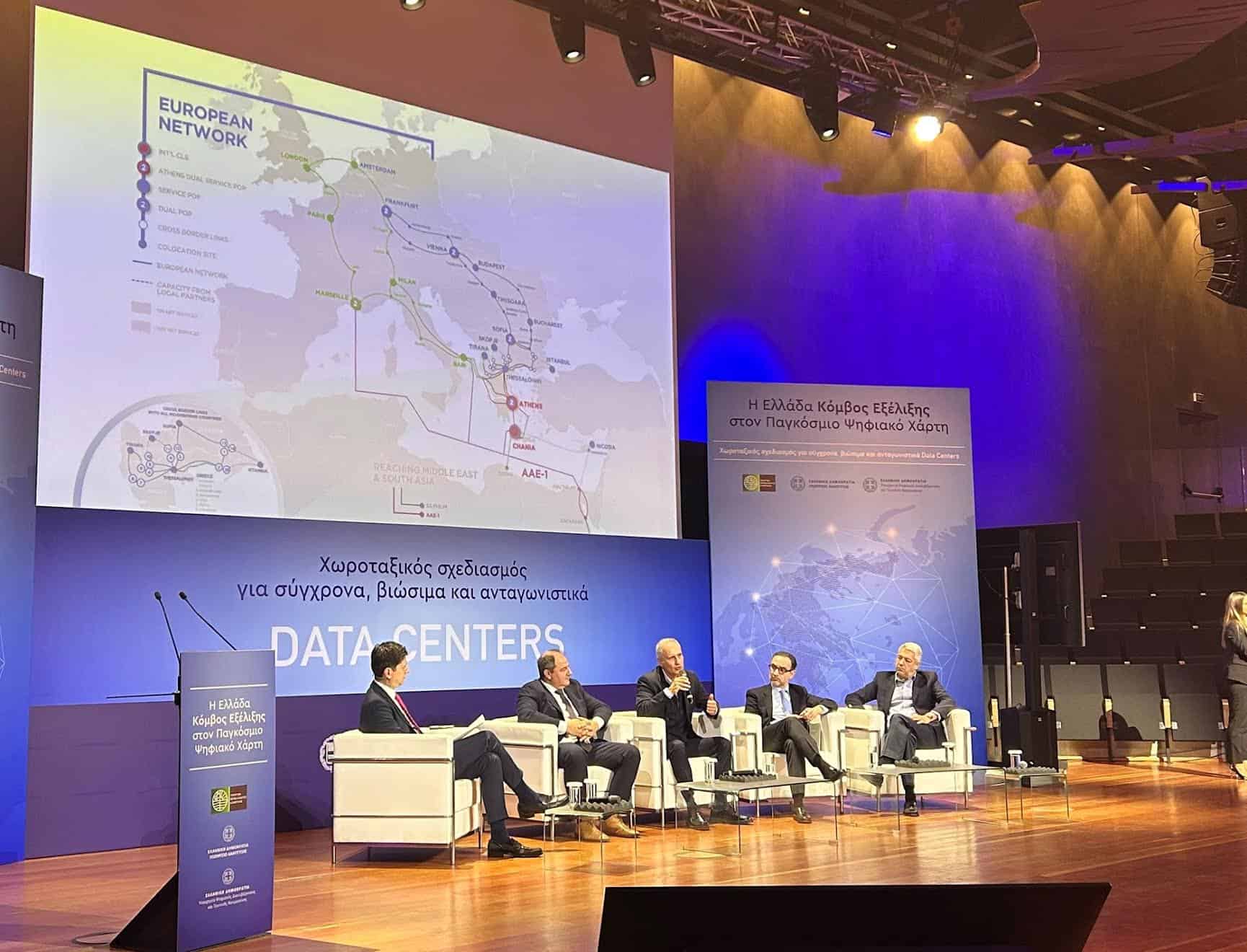 Ξεκινώντας την τοποθέτησή του, ο κ. Κωνσταντινίδης ανέφερε ότι τα δύο βασικά στοιχεία ενός ψηφιακού κόμβου είναι τα Data Centers και οι υποδομές συνδεσιμότητας. Χαρακτηριστικά σημείωσε ότι «αν τα Data Centers είναι η καρδιά της ψηφιακής οικονομίας, οι ψηφιακές υποδομές συνδεσιμότητας είναι οι αρτηρίες που τροφοδοτούν διαρκώς όλο αυτό το οικοσύστημα». Επισήμανε ότι η χώρα διαθέτει ένα στρατηγικό πλεονέκτημα, τη γεωγραφική της θέση, αποτελώντας «γέφυρα» ανάμεσα στη Μέση Ανατολή, την Ασία, τη Μεσόγειο, την Αφρική, την Ανατολική και Κεντρική Ευρώπη, και ανέλυσε πώς ο Όμιλος ΟΤΕ διασφαλίζει προηγμένες ψηφιακές υποδομές συνδεσιμότητας για τη χώρα, αξιοποιώντας το γεωστρατηγικό αυτό πλεονέκτημα με τρία βασικά χαρακτηριστικά: 1) μεγάλες χωρητικότητες για την εξυπηρέτηση της ολοένα αυξανόμενης κίνησης 2) αξιοπιστία και εφεδρικότητα με εναλλακτικές οδεύσεις και 3) τα καλύτερα ποιοτικά χαρακτηριστικά από πλευράς ταχύτητας και latency.