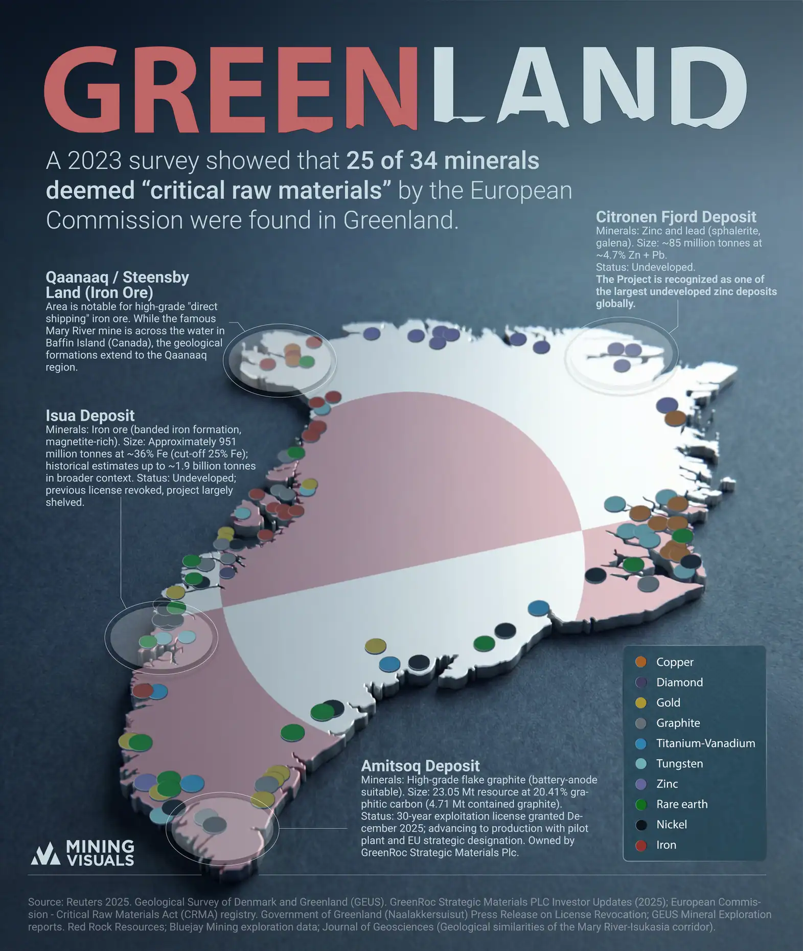 Η Γροιλανδία είναι χρήσιμη για τις ΗΠΑ λόγω της στρατηγικής της θέσης και των πλούσιων ορυκτών πόρων της. Έρευνα του 2023 έδειξε ότι 25 από τα 34 ορυκτά που θεωρούνται «κρίσιμες πρώτες ύλες» από την Ευρωπαϊκή Επιτροπή εντοπίστηκαν στη Γροιλανδία.