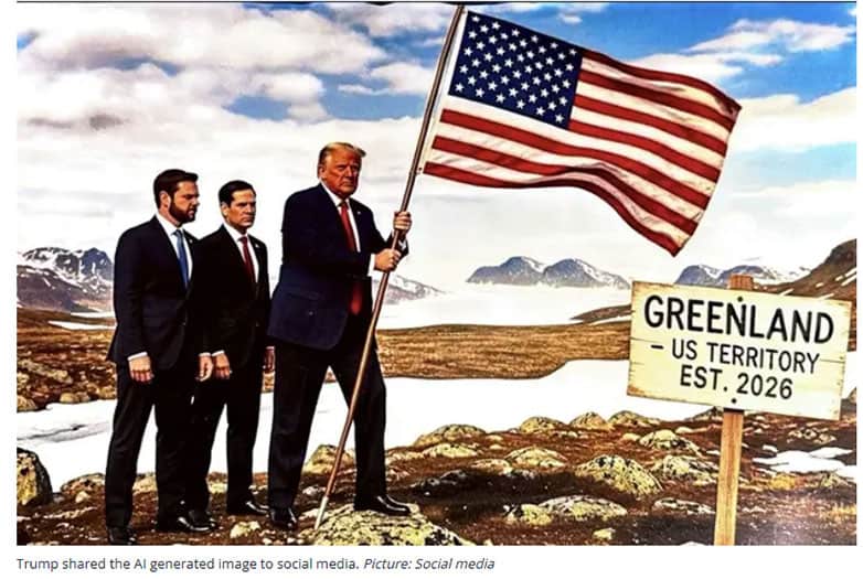Σε ότι αφορά τις βλέψεις του Τραμπ για τη Γροιλανδία, ο πρόεδρος των Ηνωμένων Πολιτειών ανήρτησε μια εικόνα που δημιουργήθηκε με τεχνητή νοημοσύνη, στην οποία εμφανίζεται μαζί με τον υπουργό Εξωτερικών Μάρκο Ρούμπιο και τον αντιπρόεδρο Τζέι Ντι Βανς, να καρφώνουν την αμερικανική σημαία στη Γροιλανδία, με μια πινακίδα που γράφει «Γροιλανδία – Αμερικανικό έδαφος – Ίδρυση 2026».