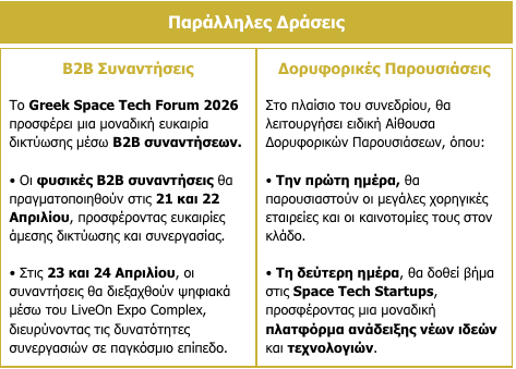To συνέδριο θα πραγματοποιηθεί την Τρίτη 21 και την Τετάρτη 22 Απριλίου 2026 από την ethosEVENTS, με τη συνδιοργάνωση της Ένωσης Ελληνικών Βιομηχανιών Διαστημικής Τεχνολογίας & Εφαρμογών (ΕΒΙΔΙΤΕ) και του Ελληνικού Συνεργατικού Σχηματισμού Διαστημικών Τεχνολογιών και Εφαρμογών (si-Cluster) του Corallia.