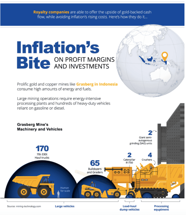 Χωρίς να απαιτούν μεγάλους στόλους οχημάτων, εργοστάσια διύλισης, και με τους μισθούς να είναι σημαντικά μικρότεροι καθώς το προσωπικό είναι περιορισμένο, οι Gold Royalties δεν φαίνεται να επηρεάζονται από τον αυξανόμενο πληθωρισμό. Πρόκειται για ένα πιο ασφαλές καταφύγιο για τους επενδυτές, σε σύγκριση με εταιρείες εξόρυξης χρυσού που πληρώνουν δεκάδες χιλιάδες υπαλλήλους σε όλο τον κόσμο, καθώς οι Gold Royalties εταιρείες σπάνια απασχολούν περισσότερα από 50 άτομα.