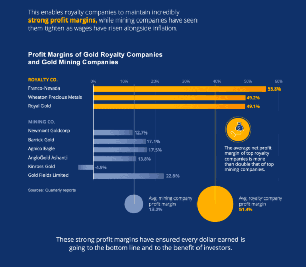Τα τελευταία τέσσερα τρίμηνα, το μέσο περιθώριο κέρδους του γίγαντα εξόρυξης χρυσού Newmont Goldcorp μειώθηκε στο 6,6% σε σύγκριση με τα μέσα περιθώρια κέρδους 22,9% των τεσσάρων προηγούμενων τριμήνων. Από την άλλη πλευρά, τα περιθώρια κέρδους της εταιρείας Gold Royalties, Franco-Nevada αυξήθηκαν από 54,8% σε 57,3% τις ίδιες χρονικές περιόδους.