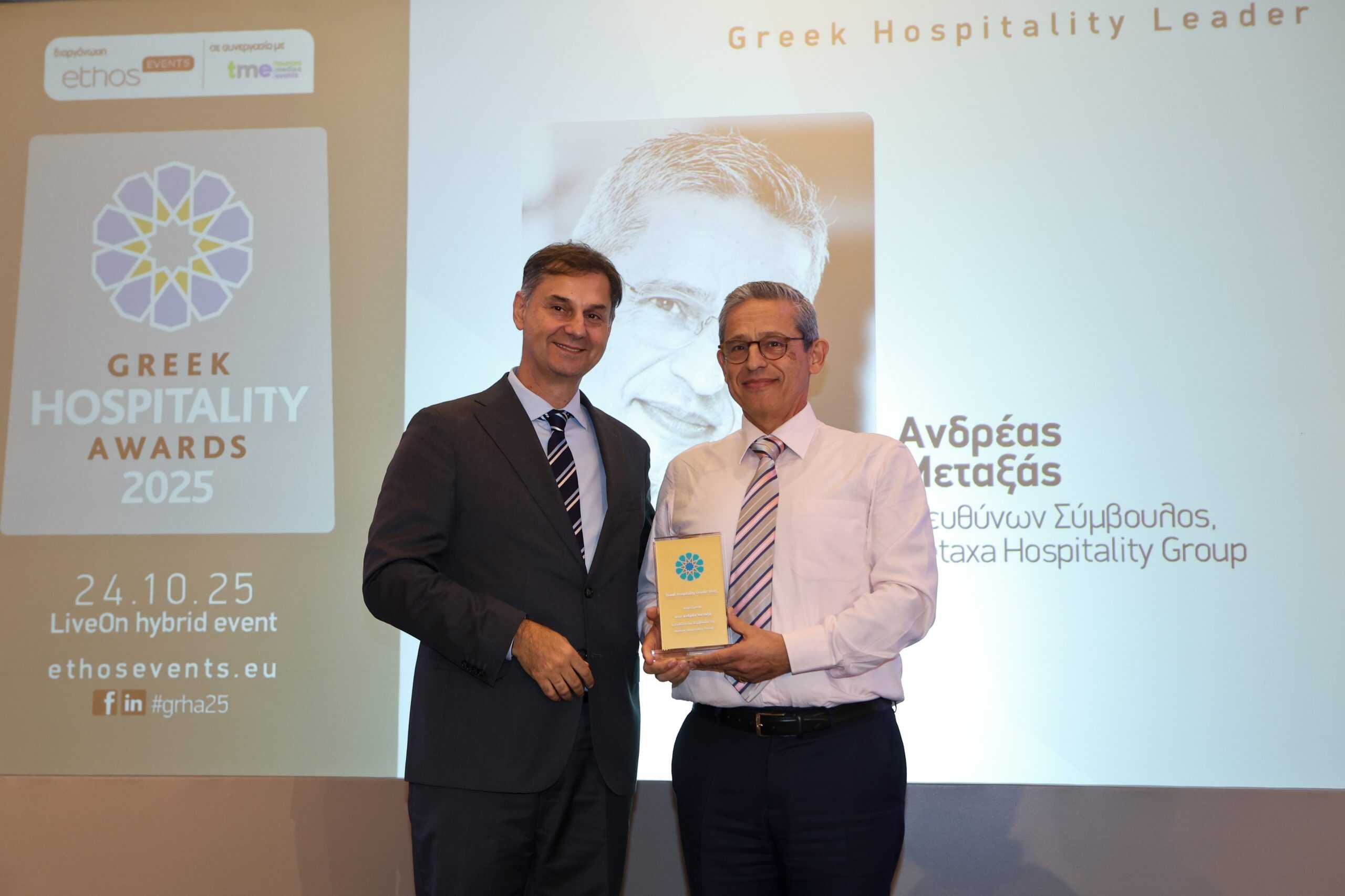 Παραλαμβάνοντας την τιμητική διάκριση Greek Hospitality Leader, ο κ. Ανδρέας Μεταξάς, Διευθύνων Σύμβουλος, Metaxa Hospitality Group, δήλωσε ότι «αυτήν τη μέρα, όλοι οι άνθρωποι του ομίλου φορούν ροζ στέλνοντας μήνυμα πρόληψης και αφύπνισης για τον καρκίνο του μαστού, σε συνεργασία με το Άλμα Ζωής». Αφιέρωσε τη διάκριση στους εργαζομένους του Metaxa Hospitality Group, εκφράζοντας τη βαθιά ευγνωμοσύνη του και τονίζοντας ότι αυτοί αποτελούν την καρδιά, τον νου και τη μεγαλύτερη δύναμη του ομίλου. «Με βαθύ σεβασμό στο περιβάλλον και στην ιστορία μας», επεσήμανε, «εξελισσόμαστε διαρκώς και ανοίγουμε νέους δρόμους για το μέλλον της φιλοξενίας. Ό,τι κάνουμε φροντίζουμε να έχει ουσία και διάρκεια στον χρόνο». Κατέληξε δηλώνοντας αισιόδοξος ότι μπροστά στο σημερινό σταυροδρόμι, οι επιχειρηματίες του τουρισμού θα επιλέξουν τον «δρόμο της ευθύνης», ώστε να χτίσουν ένα πιο υγιές μέλλον για τον κλάδο και να εκπληρώσουν το χρέος τους απέναντι στις επόμενες γενιές.