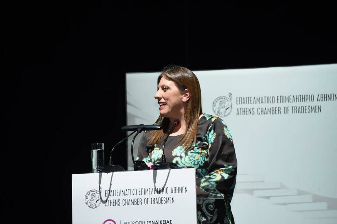Η Πρόεδρος της «Πλεύσης Ελευθερίας» Ζωή Κωνσταντοπούλου υπογράμμισε ότι είναι η μόνη γυναίκα πολιτική αρχηγός στο Κοινοβούλιο, με την κοινοβουλευτική ομάδα του κόμματός της να είναι επίσης, όπως είπε, η μοναδική με ίσο αριθμό γυναικών και ανδρών βουλευτών. Στη διάρκεια της ομιλίας της άσκησε σφοδρή κριτική στην κυβερνητική πολιτική, ζητώντας στοχευμένα μέτρα για την ενίσχυση της γυναικείας επιχειρηματικότητας αλλά και γενικότερα για τη στήριξη των μικρομεσαίων.