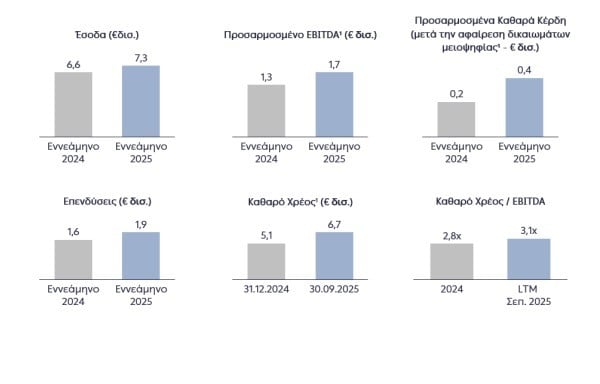 Ως αποτέλεσμα, το προσαρμοσμένο EBITDA διαμορφώθηκε σε €1,7 δισ. το εννεάμηνο του 2025 καταγράφοντας αύξηση κατά 24% σε σχέση με την αντίστοιχη περυσινή περίοδο.