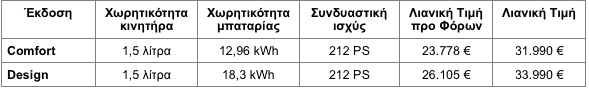 Η έκδοση Design, με μεγαλύτερη μπαταρία για αυξημένη αμιγώς ηλεκτρική αυτονομία, προσθέτει αισθητήρες στάθμευσης εμπρός, κάμερα 360°, ηλεκτρικά ανοιγόμενη πίσω πόρτα, θερμαινόμενα μπροστινά καθίσματα και βάση ασύρματης φόρτισης 15W για smartphone.