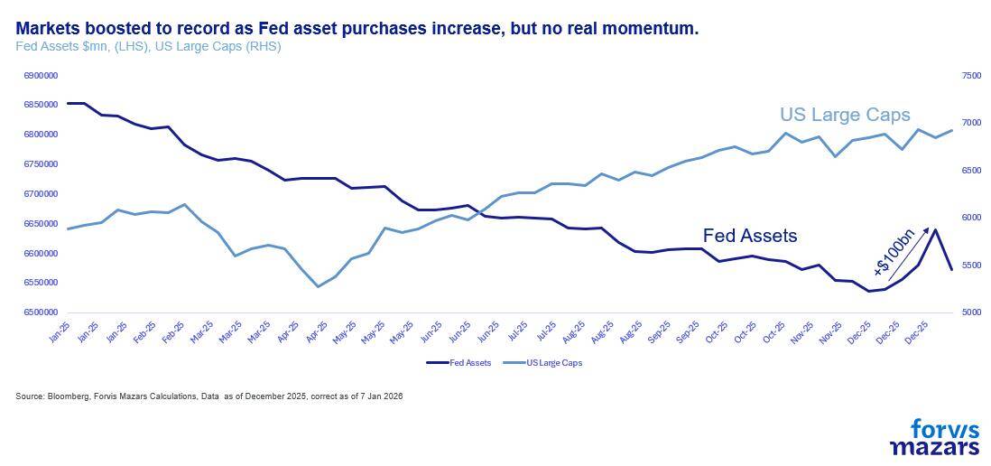 Οι μετοχές ανεβαίνουν από τα τέλη του 2025, ενώ η Fed αγοράζει ξανά τίτλους στην ανοιχτή αγορά για να διασφαλίσει ότι οι αναταράξεις, καθώς σταθεροποιεί τα αποθέματά της, παραμένουν διαχειρίσιμες (πρόκειται για διαχείριση κινδύνου, όχι για Ποσοτική Χαλάρωση/QE).