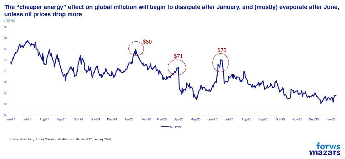 Παρόλα αυτά, ως οικονομολόγος δεν μπορώ να χαλαρώσω. Ο εμπορικός πόλεμος του περασμένου έτους θα έπρεπε να έχει επιφέρει χειρότερα αποτελέσματα. Η μεταβλητή που άλλαξε την εξίσωση ήταν η πτώση 25% στις τιμές του πετρελαίου, χάρη στη Σαουδική Αραβία. Ο χαμηλότερος πληθωρισμός, σε συνδυασμό με τις επενδύσεις στην AI, κράτησαν την πραγματική ανάπτυξη πάνω από τις προβλέψεις. Ωστόσο, το «δώρο» του αποπληθωρισμού από το πετρέλαιο αρχίζει να εξαντλείται μετά τον Ιανουάριο και θα μπορούσε να εξαλειφθεί σημαντικά μετά τον Ιούνιο, εκτός εάν το πετρέλαιο πέσει κάτω από τα 55 δολάρια.