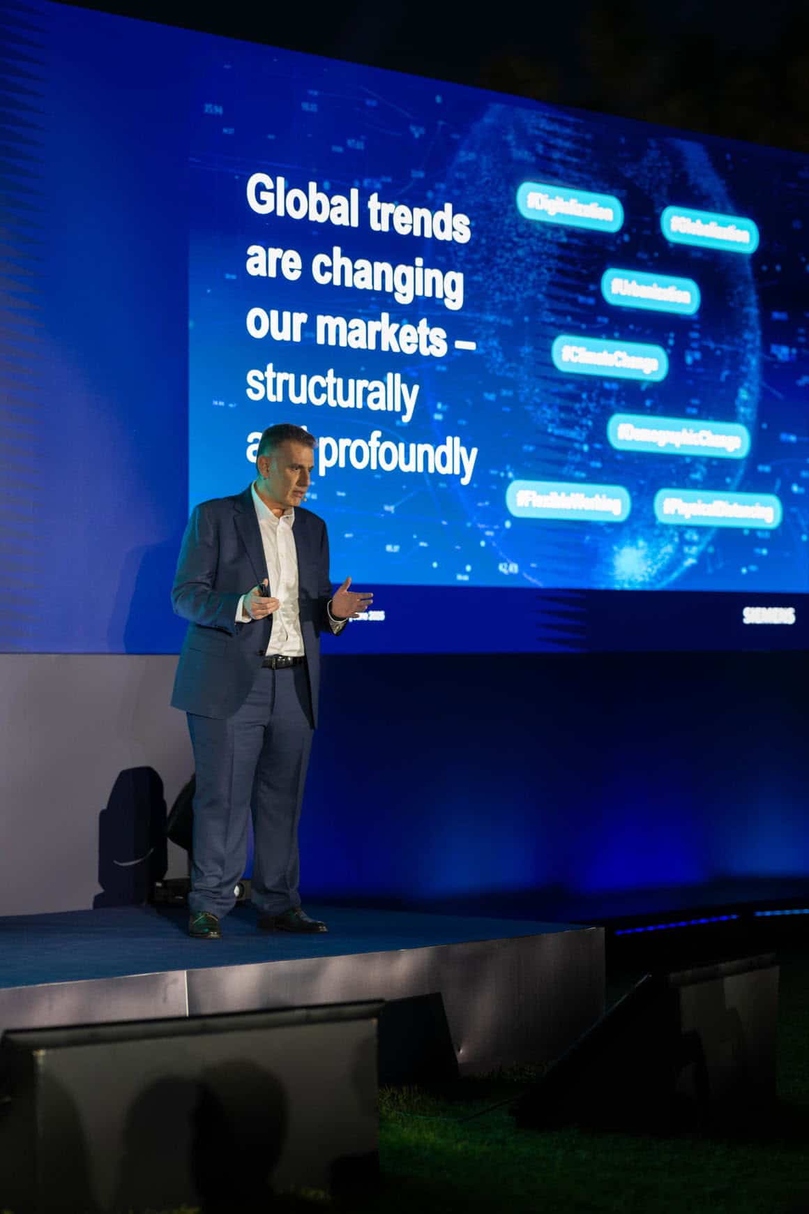 Ο Βασίλης Χατζίκος, CEO της Siemens Ελλάδος, καλωσόρισε τους προσκεκλημένους με αφορμή τη συμπλήρωση 125 ετών παρουσίας της Siemens στην Ελλάδα, ευχαριστώντας τους για τη μακρόχρονη συνεργασία και την εμπιστοσύνη τους στο τεχνολογικό προφίλ της εταιρείας. Παράλληλα, αναφέρθηκε στις προκλήσεις της εποχής, εστιάζοντας στην ανάγκη για ψηφιακό και ενεργειακό μετασχηματισμό των επιχειρήσεων για να παραμείνουν ανταγωνιστικές στη νέα ψηφιακή εποχή.
