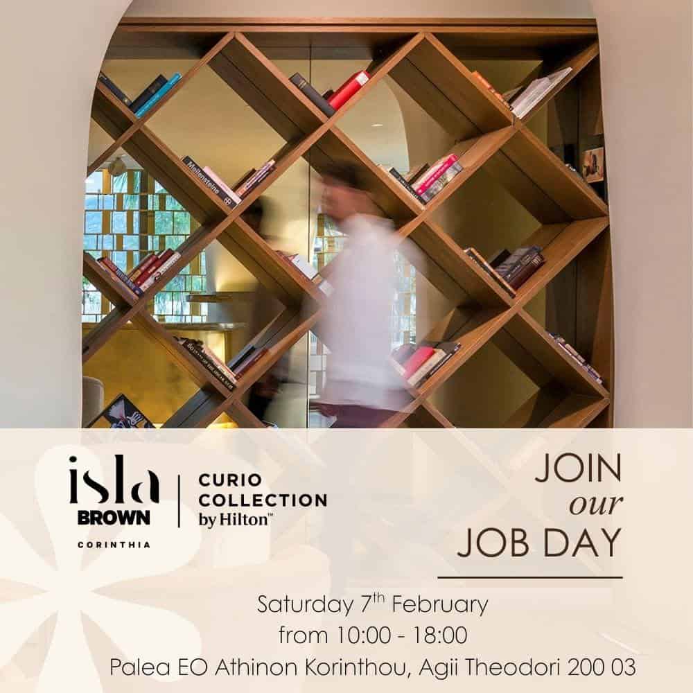Η Brown Hotels διοργανώνει Job Day στο Isla Brown Corinthia Resort, Curio Collection by Hilton, το Σάββατο 7 Φεβρουαρίου 2026, από τις 10:00 έως τις 18:00, στις εγκαταστάσεις του resort στους Αγίους Θεοδώρους Κορινθίας (Παλαιά ΕΟ Αθηνών – Κορίνθου).