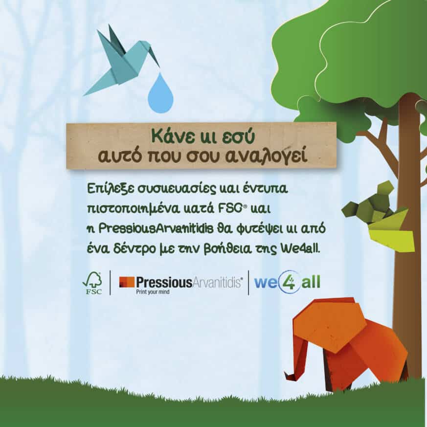 Η εταιρεία συνεχίζει να προσκαλεί κάθε επιχείρηση να επιλέξει την πιστοποίηση κατά FSC® και δεσμεύεται να φυτέψει για κάθε παραγγελία ένα δέντρο, σε συνεργασία με τη We4all. Στόχος της είναι να φυτέψει έως το τέλος του χρόνου 1000 δέντρα, ώστε να εισφέρει στην σε ένα βιώσιμο μέλλον για τις επόμενες γενιές.
