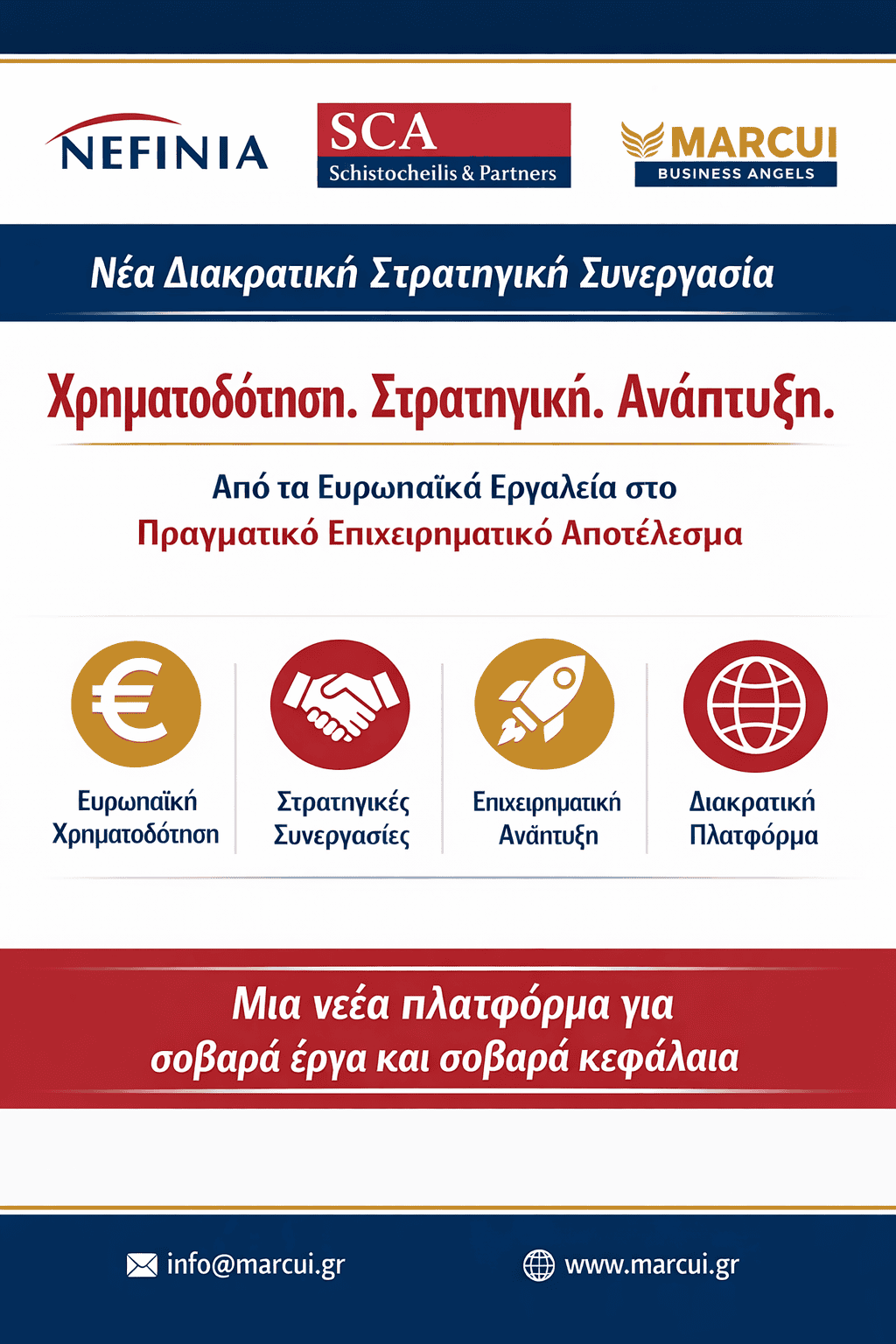 Με ιδιαίτερη χαρά ανακοινώνεται η έναρξη μιας νέας στρατηγικής συνεργασίας μεταξύ των οργανισμών NEFINIA, SCA |Schistocheilis & Partners και MARCUI Business Angels, με στόχο την ενίσχυση της πρόσβασης επιχειρήσεων σε χρηματοδότηση, επενδυτικά εργαλεία και ευρωπαϊκά προγράμματα.