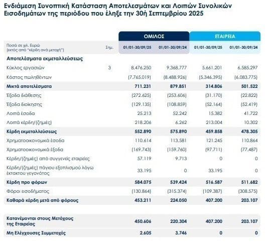 Τα καθαρά κέρδη μετά από φόρους εκτοξεύθηκαν στα 453,2 εκατ. ευρώ, σχεδόν διπλάσια από τα 224 εκατ. ευρώ πέρυσι, ενώ τα κέρδη εκμεταλλεύσεως παρέμειναν σε ιδιαίτερα υψηλά επίπεδα, στα 552,9 εκατ. ευρώ, συγκρίσιμα με τα 575,9 εκατ. ευρώ του 2024.
