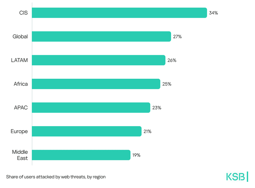 Σε παγκόσμιο επίπεδο, το 27% των χρηστών δέχθηκε επιθέσεις από διαδικτυακές απειλές — δηλαδή κακόβουλο λογισμικό που στοχεύει χρήστες όταν βρίσκονται online. Οι διαδικτυακές απειλές δεν περιορίζονται αποκλειστικά στην online δραστηριότητα, αλλά τελικά εμπλέκουν το διαδίκτυο σε κάποιο στάδιο για την πρόκληση βλάβης.