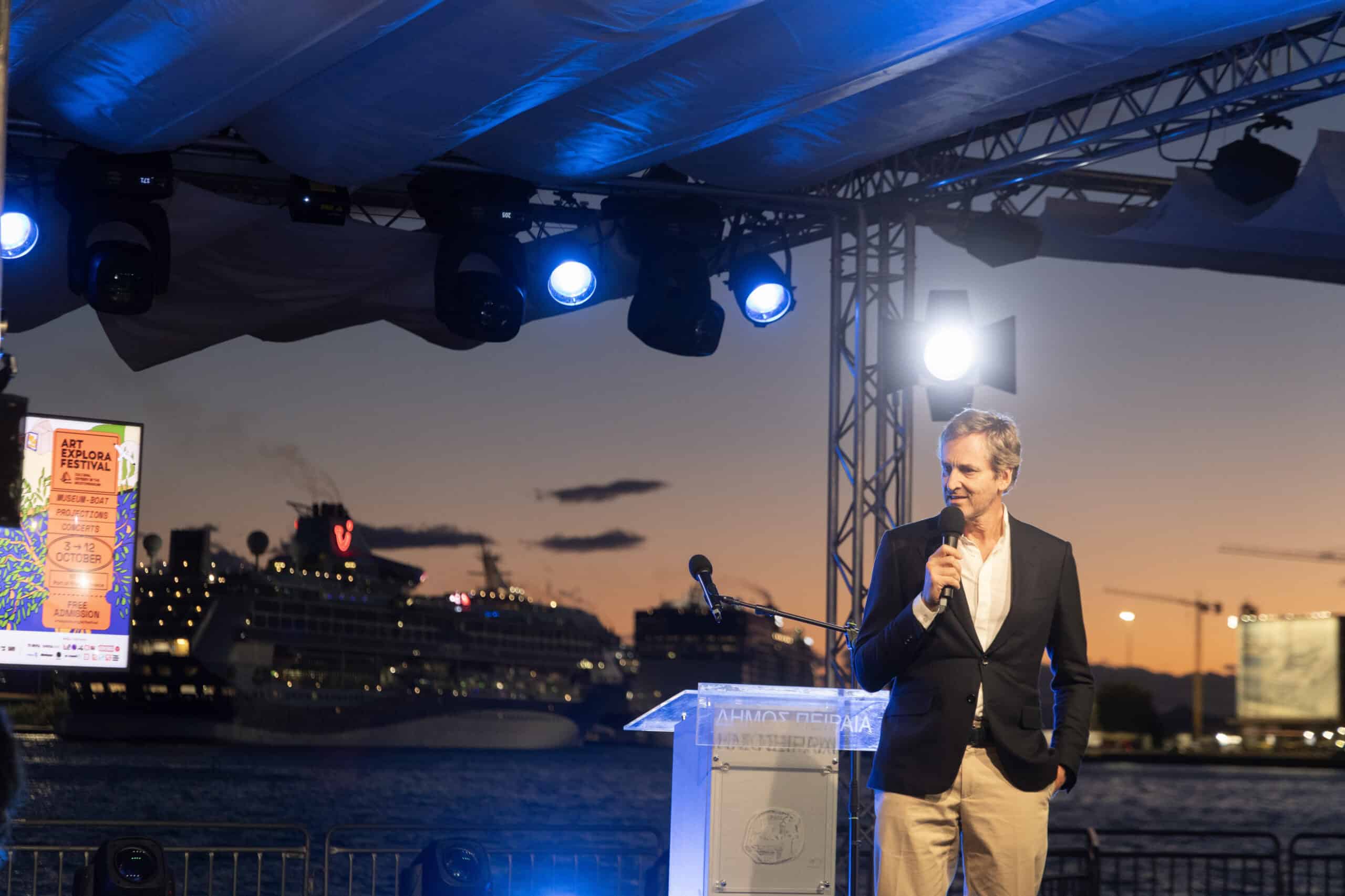 «Είναι μεγάλη τιμή να σας υποδεχόμαστε στην πόλη μας, στο λιμάνι του Πειραιά, μια ιστορική πύλη της Ελλάδας προς τον κόσμο. Η πόλη μας υπήρξε πάντα σημείο αναφοράς πολιτισμών, ιδεών και δημιουργίας. Σήμερα, φιλοξενώντας αυτό το καινοτόμο πλωτό μουσείο, ο Πειραιάς αγκαλιάζει ξανά τις αξίες της ανοιχτότητας, του διαλόγου και της πολιτιστικής ανταλλαγής. Είμαστε υπερήφανοι που το Art Explora επέλεξε τον Πειραιά, στην Ελλάδα, ως έναν από τους σταθμούς του. Αυτές οι πρωτοβουλίες υπογραμμίζουν τη σημασία της πρόσβασης στην τέχνη για όλους, φέρνοντας τον πολιτισμό πιο κοντά στους πολίτες, τους επισκέπτες και, ιδιαίτερα, στις νεότερες γενιές.»