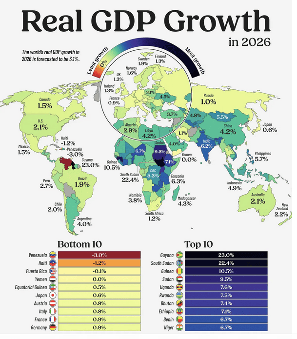Χάρη σε μια τεράστια ανακάλυψη πηγής πετρελαίου, η Γουιάνα προβλέπεται να βιώσει την ισχυρότερη αύξηση του πραγματικού ΑΕΠ το 2026, στο 23%. Αρκετές αφρικανικές χώρες προβλέπεται να δουν ανάπτυξη άνω του 6%, λόγω της αυξανόμενης οικονομικής τους σταθερότητας.
