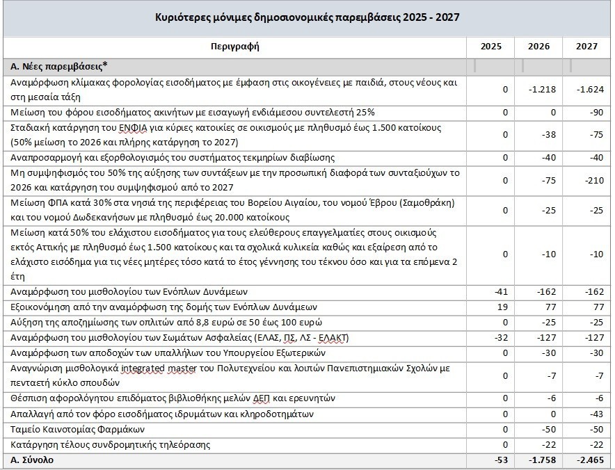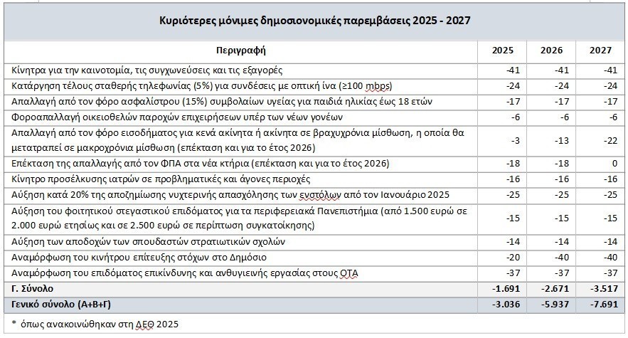 Από το 2025 έως το 2027, το οικονομικό επιτελείο ενεργοποιεί μέτρα συνολικού ύψους 7,7 δισ. ευρώ με στόχο να αυξήσει την αγοραστική δύναμη, να περιορίσει τις φορολογικές επιβαρύνσεις και να δημιουργήσει νέα κίνητρα για ανάπτυξη και αποκέντρωση, χωρίς να τίθεται σε κίνδυνο η δημοσιονομική σταθερότητα.