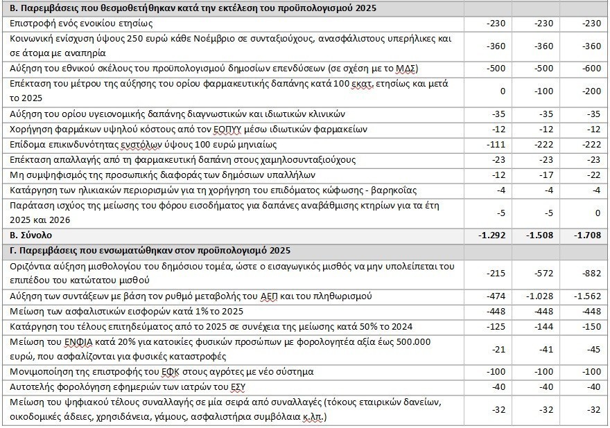 Το 2025 μειώνονται οι ασφαλιστικές εισφορές κατά μία μονάδα, καταργείται το τέλος επιτηδεύματος, αυξάνονται κατά 2,4% οι συντάξεις, ενώ θεσπίζεται η ετήσια ενίσχυση των 250 ευρώ για χαμηλοσυνταξιούχους και άτομα με αναπηρία.