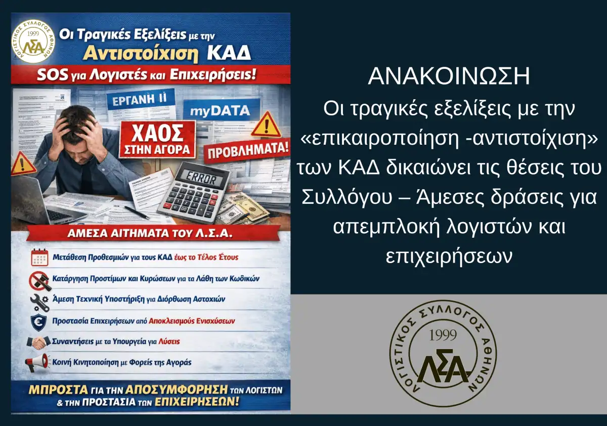 Ο Λογιστικός Σύλλογος Αθηνών, έχοντας προειδοποιήσει έγκαιρα με ανακοίνωση και επίσημη επιστολή ήδη από τον Ιανουάριο 2026, δυστυχώς επιβεβαιώνεται από την σύγχυση που προκάλεσε η ταυτόχρονη επικαιροποίηση των ΚΑΔ σε μία άκαιρη χρονική συγκυρία ταυτόχρονα με την έναρξη υποβολής των φορολογικών δηλώσεων , με εξελίξεις σε πλατφόρμες για τα ακίνητα , με τις νέες εφαρμογές για τα εργασιακά κλπ.
