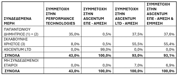 • Η Ascentum αποτελεί συνδεδεμένο μέρος της Εταιρείας, κατά την έννοια του άρθρου 99 του Ν. 4548/2018, καθόσον οι κ.κ. Δημήτριος Παπαντωνίου και Χρήστος Σκλαβούνης, βασικοί μέτοχοι της Εταιρείας συμμετέχουν και στην υπό εξαγορά Ascentum σύμφωνα με τα κάτωθι ποσοστά: