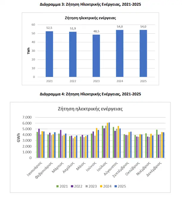 Σύμφωνα με στοιχεία της μελέτης, η ζήτηση ηλεκτρικής ενέργειας στην Ελλάδα διαμορφώθηκε στις 54 TWh το 2025, αμετάβλητη σε σύγκριση με το 2024. Σε βάθος πενταετίας (2021-2025), η ζήτηση ηλεκτρικής ενέργειας το 2025 βρισκόταν στο υψηλότερο επίπεδο, όπως και το 2024.