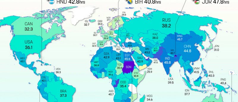 Καθώς ο παγκόσμιος μέσος όρος ωρών εργασίας διαμορφώνεται στις 38,7 ώρες εβδομαδιαίως, το χάσμα μεταξύ των χωρών με τους πιο σκληρά και τους λιγότερο σκληρά εργαζομένους αγγίζει σχεδόν τις 30 ώρες.