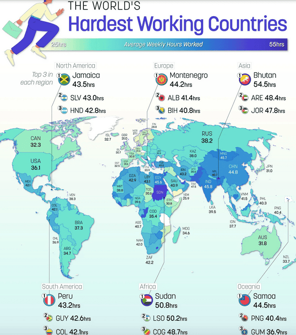 Το 2025, το Μπουτάν ξεχωρίζει ως το έθνος με τους πιο σκληρά εργαζόμενους στον κόσμο, οι οποίοι δουλεύουν κατά μέσο όρο 54,5 ώρες την εβδομάδα. Πολλές οικονομίες της Νότιας και Νοτιοανατολικής Ασίας βρίσκονται επίσης κοντά στην κορυφή, συμπεριλαμβανομένων των ΗΑΕ (48,4 ώρες), του Πακιστάν (47,5 ώρες) και της Ινδίας (45,8 ώρες). Οι εκτεταμένες εβδομάδες εργασίας σε αυτές τις περιοχές συχνά αντανακλούν labor-intensive βιομηχανίες, λιγότερες θέσεις μερικής απασχόλησης και περιορισμένα προγράμματα κοινωνικής ασφάλισης – παράγοντες που οδηγούν σε περισσότερες ώρες εργασίας τόσο για τους υπαλλήλους όσο και για τους αυτοαπασχολούμενους.