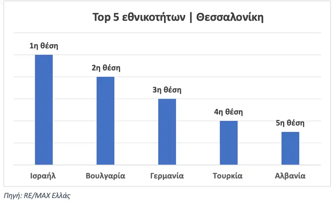 Οι Ισραηλινοί βρίσκονται στην πρώτη θέση μεταξύ των ξένων που αγοράζουν ακίνητα στη Θεσσαλονίκη, ενώ την πρώτη πεντάδα συμπληρώνουν αγοραστές από τη Βουλγαρία, τη Γερμανία, την Τουρκία και την Αλβανία.