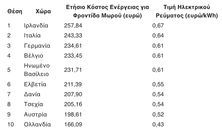 Η Ιρλανδία κατατάσσεται ως η πιο ακριβή χώρα για τα κόστη ενέργειας φροντίδας μωρού, με τις οικογένειες να πληρώνουν σχεδόν 256,90 ευρώ ετησίως για να τροφοδοτήσουν τις βασικές συσκευές φροντίδας του μωρού τους. Η Ιταλία ακολουθεί με 243,72 ευρώ, ενώ η Γερμανία με 239,23 ευρώ και το Βέλγιο με 238,47 ευρώ βρίσκονται επίσης ψηλά στη λίστα, αντανακλώντας το υψηλό κόστος ζωής και τη μεγάλη ζήτηση ενέργειας στη Δυτική Ευρώπη.