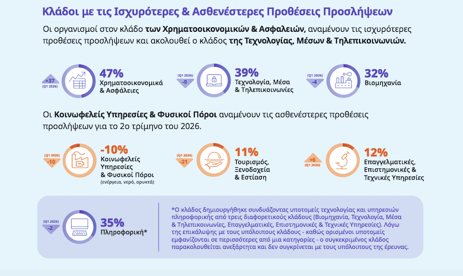 Τα Χρηματοοικονομικά και οι Ασφάλειες είναι ο πιο ανταγωνιστικός κλάδος στην Ελλάδα για το δεύτερο τρίμηνο του 2026 με δείκτη προοπτικών απασχόλησης 47 μονάδων. Ο κλάδος κατέγραψε τη μεγαλύτερη ετήσια αύξηση, +50 μονάδες σε σχέση με το 2ο τρίμηνο του 2025, και το υψηλότερο επίπεδο από την έναρξη καταγραφής το 2ο τρίμηνο του 2008.