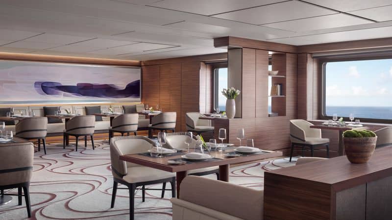 Το μεγάλο Evrima Room, το κεντρικό εστιατόριο του γιοτ, προσφέρει πιάτα εμπνευσμένα από τους προορισμούς της γραμμής. Ένα μενού γευσιγνωσίας πέντε πιάτων με συνδυασμούς κρασιού και σαμπάνιας στο S.E.A. Το (Sven Elverfeld Aboard) δημιουργήθηκε από τον σεφ Sven Elverfeld του Aqua με τρία αστέρια Michelin στο Ritz-Carlton στο Wolfsburg της Γερμανίας (και παρέχεται με επιπλέον χρέωση 285 $ ανά άτομο). Στο εστιατόριο Talaat Nam, δειπνήστε σε εσωτερικούς ή εξωτερικούς χώρους με πιάτα της Νοτιοανατολικής Ασίας ή κατευθυνθείτε στο σούσι μπαρ. Η υπηρεσία δωματίου είναι διαθέσιμη όλο το 24ωρο.