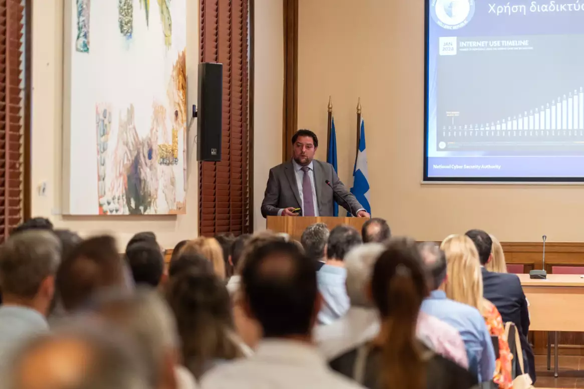 Για το ευρωπαϊκό και εθνικό πλαίσιο για την κυβερνοασφάλεια μίλησε ο Ιωάννης Αλεξάκης, Γενικός Διευθυντής Επιτελικού Σχεδιασμού, Εθνική Αρχή Κυβερνοασφάλειας, Υπουργείο Ψηφιακής Διακυβέρνησης, σημείωσε ότι η Ελλάδα έχει, ήδη, νομοθετήσει από το 2022 για την κυβερνοασφάλεια και την τεχνητή νοημοσύνη, δημιουργώντας, μάλιστα και 13 διαφορετικές νομοθετικές πρωτοβουλίες. Σε αυτό το σημείο μίλησε εκτεταμένα για τη σημασία της ευρωπαϊκής οδηγίας NIS2, η οποία υποχρεώνει τα κράτη μέλη να προχωρήσουν σε τεχνολογικές προσαρμογές για να θωρακιστούν θεσμικά απέναντι στις νέες ψηφιακές προκλήσεις. Έχει, δε, εφαρμογή στο μεγαλύτερο μέρος των επιχειρήσεων, από 50 άτομα και άνω, σε κλάδους όπως η εφοδιαστική αλυσίδα, τα φάρμακα, οι τηλεπικοινωνίες κα.
