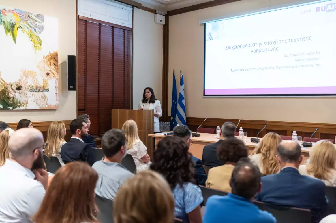 Λαμβάνοντας πρώτη το λόγο, η Δρ. Μαρία Μποζούδη, Senior Advisor, Τομέας Βιομηχανίας, Ανάπτυξης και Τεχνολογίας ΣΕΒ αναφέρθηκε στη χαμηλή διείσδυση της χώρας μας στην τεχνητή νοημοσύνη, σε ποσοστό μόλις 4%, την ώρα που στην Ευρώπη είναι στο 8%, προσθέτοντας, μάλιστα, ότι τα 2/3 των επιχειρήσεων θεωρούν ότι δεν τους αφορά. Σε αυτό το πλαίσιο, έκανε μνεία στην πρωτοβουλία του ΣΕΒ σε συνεργασία με την Google, το ‘’RU AI’’, η οποία περιλαμβάνει δράσεις τεχνολογικής ενδυνάμωσης, συνιστώντας έναν οδηγό με τα οφέλη της τεχνητής νοημοσύνης.