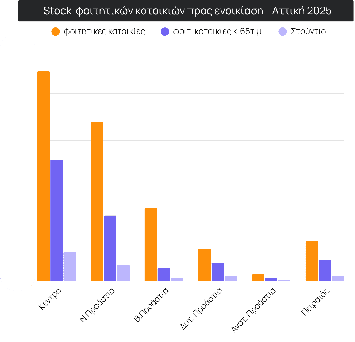 Κατά 5,4% αυξήθηκε μέση ζητούμενη τιμή ενοικίασης φοιτητικής κατοικίας στην Αττική κατά το 2ο τρίμηνο του 2025 σε σχέση με την ίδια περίοδο το 2024. Η χαμηλότερη ΜΖΤ € /τ.μ. ανάμεσα στις πιο δημοφιλείς φοιτητικές περιοχές της Αθήνας εντοπίζεται στην περιοχή της Νίκαιας στα Προάστια του Πειραιά (9,0€/τ.μ.), ενώ η ΜΖΤ ενός φοιτητικού σπιτιού με εμβαδόν μικρότερο των 65 τ.μ. στη Νίκαια ανέρχεται στα 500€. Υψηλές ΜΖΤ ενοικίασης φοιτητικών κατοικιών καταγράφονται σε παραδοσιακά ακριβές περιοχές της Αθήνας όπως η περιοχή Μετς-Καλλιμάρμαρο, Κουκάκι-Μακρυγιάννη και Κολωνάκι-Λυκαβηττός όπου η μέση ζητούμενη τιμή ανά τετραγωνικό μέτρο κυμαίνεται μεταξύ 13-16,5€/τ.μ. Ενδεικτικά, στην περιοχή του Ζωγράφου, την πλέον φοιτητική περιοχή της Αθήνας λόγω της εγγύτητάς της στην Πανεπιστημιούπολη και την Πολυτεχνειούπολη, ένα φοιτητικό σπίτι μικρότερο των 65 τ.μ. έχει μέση ζητούμενη τιμή ενοικίασης 534€.