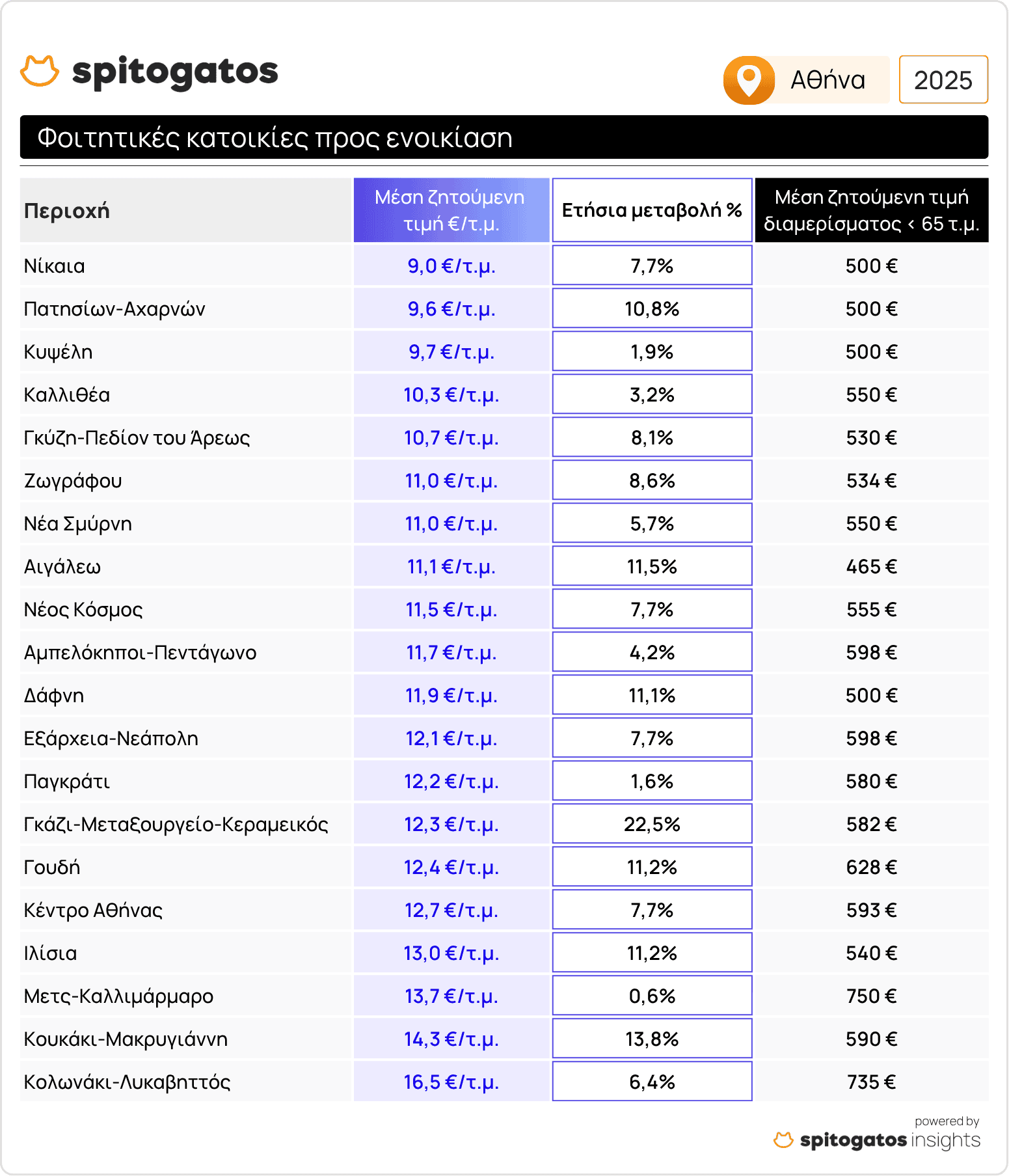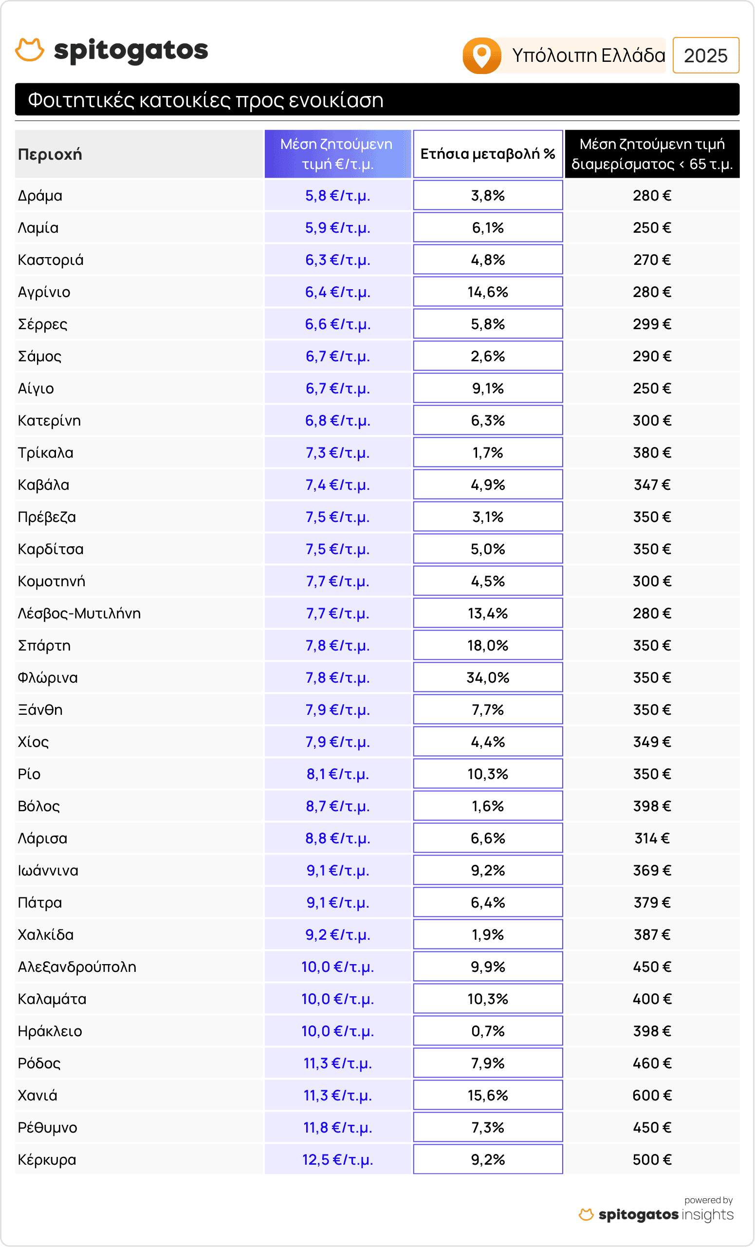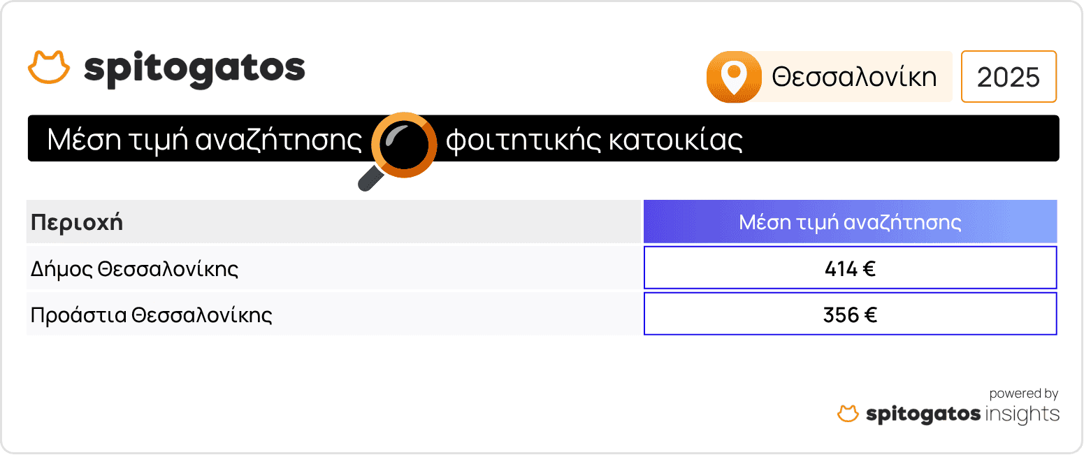 Η περίοδος εύρεσης φοιτητικής κατοικίας στις μεγαλύτερες πόλεις της χώρας αλλά και σε φοιτητουτοπόλεις της επαρχίας έχει ήδη ξεκινήσει μετά την ανακοίνωση των βαθμολογιών των γραπτών Πανελλήνιων εξετάσεων λόγω της αυξημένης ζήτησης σε σχέση με την προσφορά κατοικιών. Το Spitogatos Insights κατέγραψε την εξέλιξη των μέσων ζητούμενων τιμών (ΜΖΤ) ενοικίασης φοιτητικών κατοικιών στις μεγαλύτερες φοιτητουπόλεις της Ελλάδας.