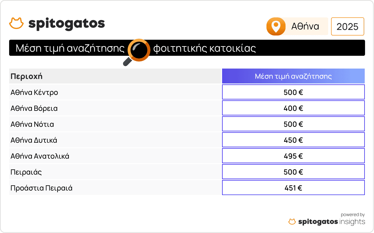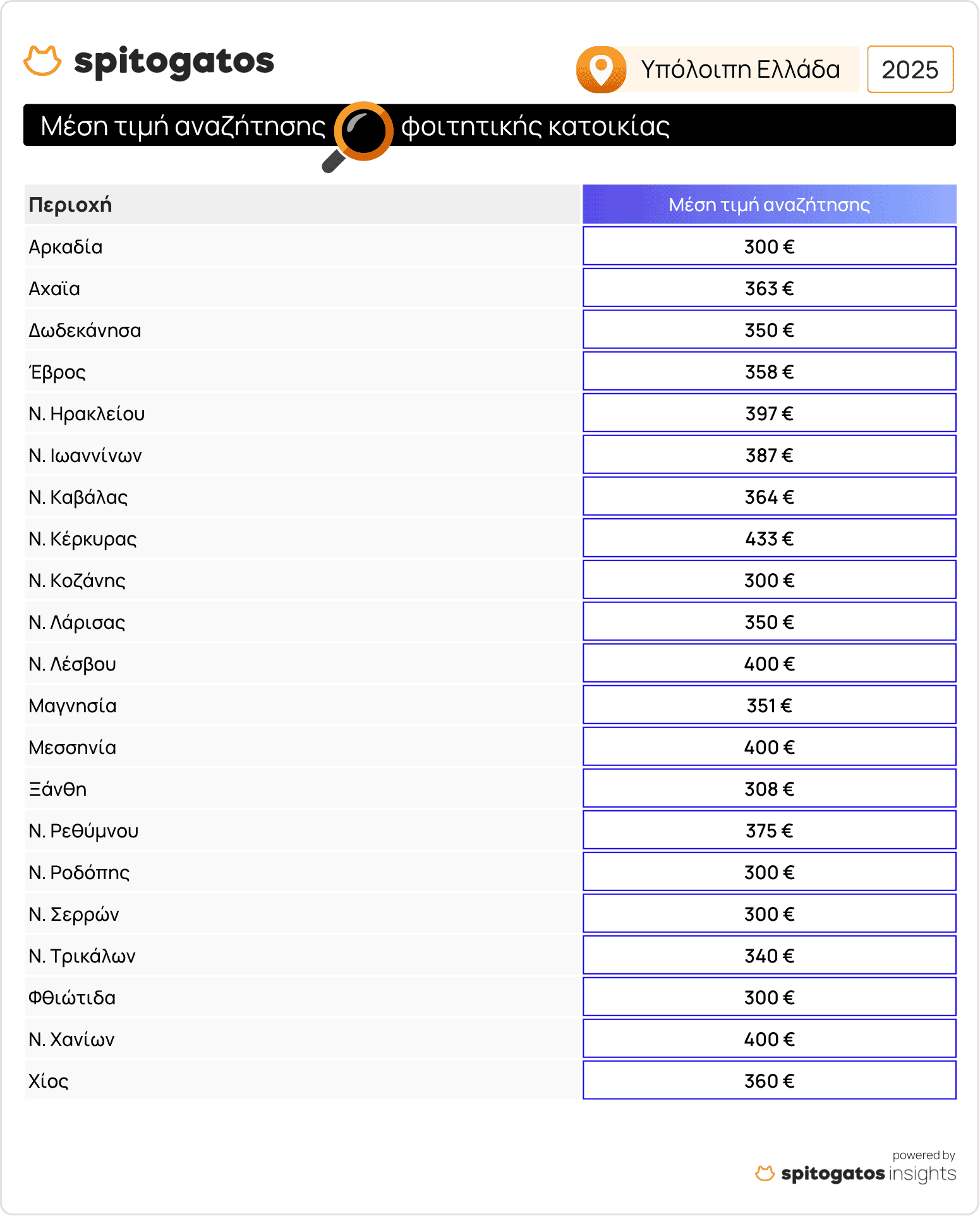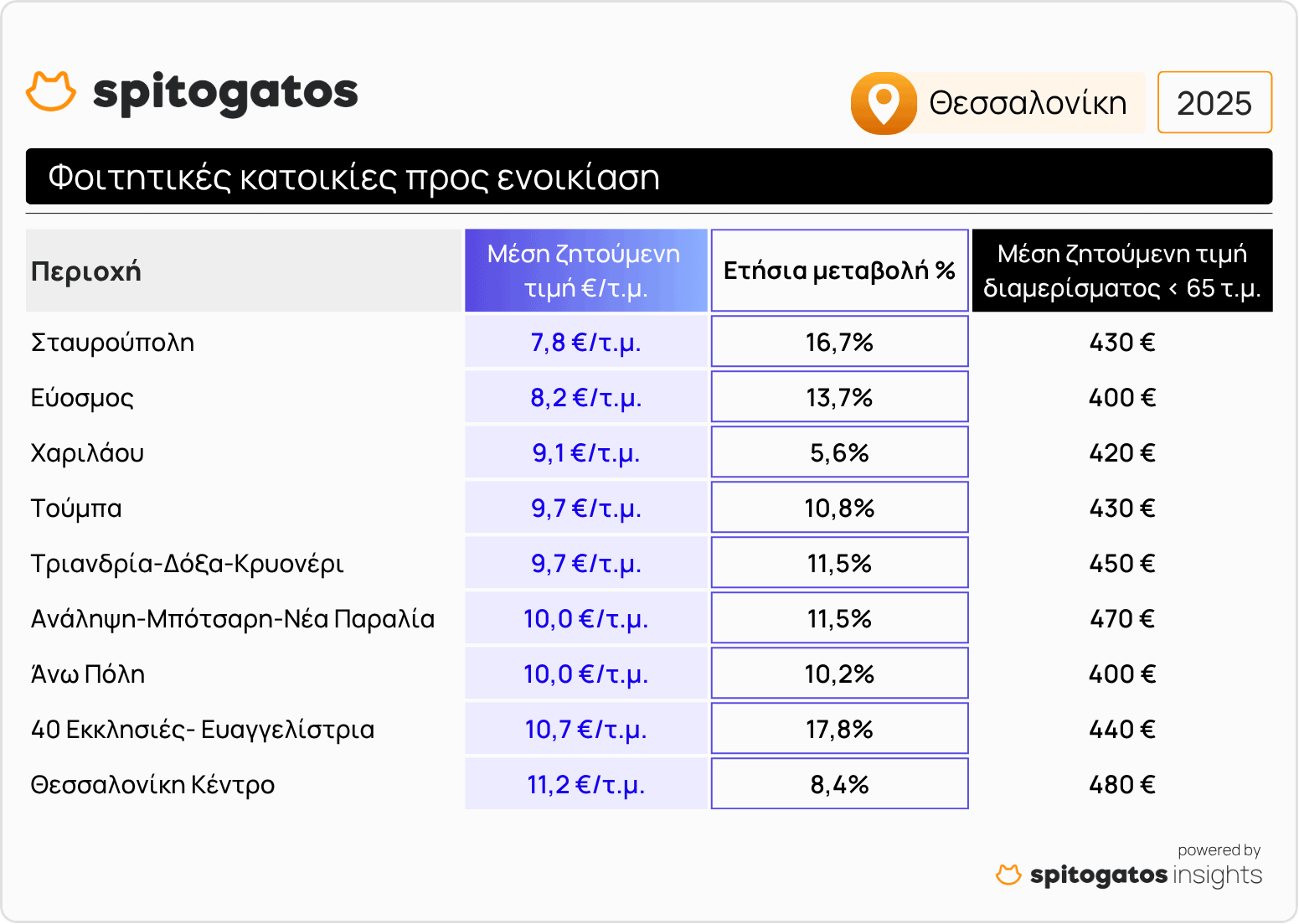 Η περίοδος εύρεσης φοιτητικής κατοικίας στις μεγαλύτερες πόλεις της χώρας αλλά και σε φοιτητουτοπόλεις της επαρχίας έχει ήδη ξεκινήσει μετά την ανακοίνωση των βαθμολογιών των γραπτών Πανελλήνιων εξετάσεων λόγω της αυξημένης ζήτησης σε σχέση με την προσφορά κατοικιών. Το Spitogatos Insights κατέγραψε την εξέλιξη των μέσων ζητούμενων τιμών (ΜΖΤ) ενοικίασης φοιτητικών κατοικιών στις μεγαλύτερες φοιτητουπόλεις της Ελλάδας.